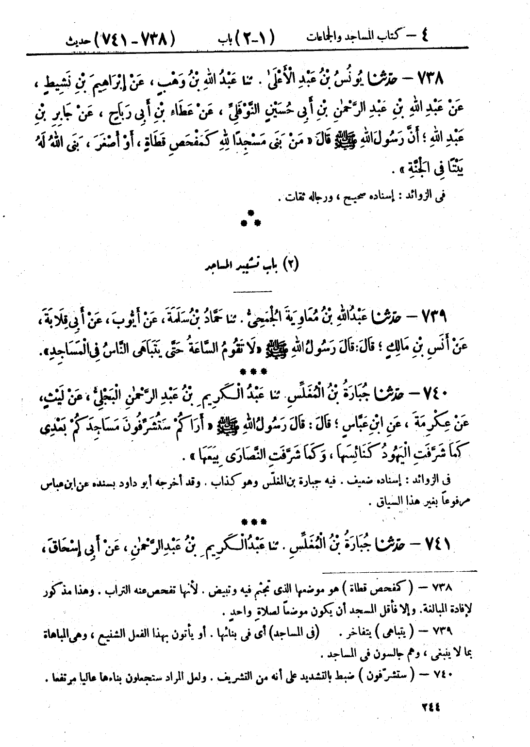 739 - حَدَّثَنَا عَبْدُ اللَّهِ بْنُ مُعَاوِيَةَ الْجُمَحِيُّ قَالَ: حَدَّثَنَا حَمَّادُ بْنُ سَلَمَةَ، عَنْ أَيُّوبَ، عَنْ أَبِي قِلَابَةَ، عَنْ أَنَسِ بْنِ مَالِكٍ قَالَ: قَالَ رَسُولُ اللَّهِ صَلَّى اللهُ عَلَيْهِ وَسَلَّمَ: «§لَا تَقُومُ السَّاعَةُ حَتَّى يَتَبَاهَى النَّاسُ فِي الْمَسَاجِدِ»