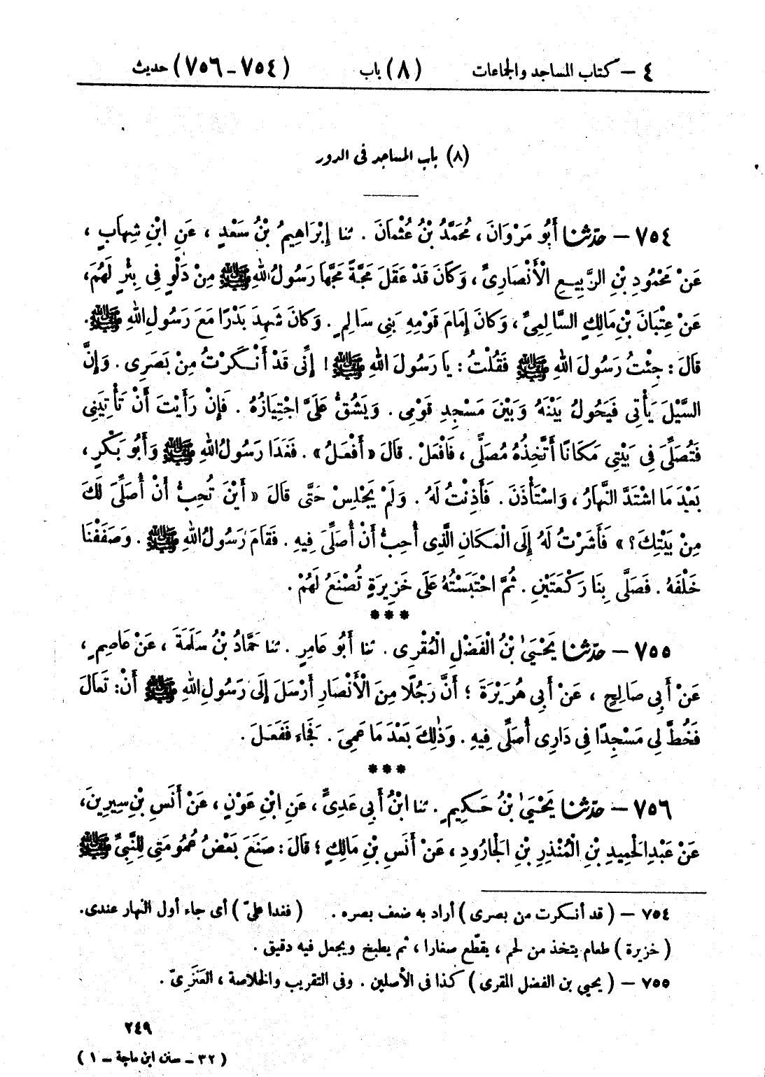 756 - حَدَّثَنَا يَحْيَى بْنُ حَكِيمٍ قَالَ: حَدَّثَنَا ابْنُ أَبِي عَدِيٍّ، عَنِ ابْنِ عَوْنٍ، عَنْ أَنَسِ بْنِ سِيرِينَ، عَنْ عَبْدِ الْحَمِيدِ بْنِ الْمُنْذِرِ بْنِ الْجَارُودِ، عَنْ أَنَسِ بْنِ مَالِكٍ، قَالَ: صَنَعَ بَعْضُ عُمُومَتِي لِلنَّبِيِّ صَلَّى اللهُ عَلَيْهِ وَسَلَّمَ طَعَامًا، فَقَالَ لِلنَّبِيِّ صَلَّى اللهُ عَلَيْهِ وَسَلَّمَ: «إِنِّي أُحِبُّ أَنْ تَأْكُلَ فِي بَيْتِي، وَتُصَلِّيَ فِيهِ» قَالَ: فَأَتَاهُ، وَفِي الْبَيْتِ فَحْلٌ مِنْ هَذِهِ الْفُحُولِ، فَأَمَرَ بِنَاحِيَةٍ مِنْهُ، فَكُنِسَ وَرُشَّ، «§فَصَلَّى، وَصَلَّيْنَا مَعَهُ» قَالَ أَبُو عَبْدِ اللَّهِ بْنُ مَاجَةَ: الْفَحْلُ: هُوَ الْحَصِيرُ الَّذِي قَدِ اسْوَدَّ