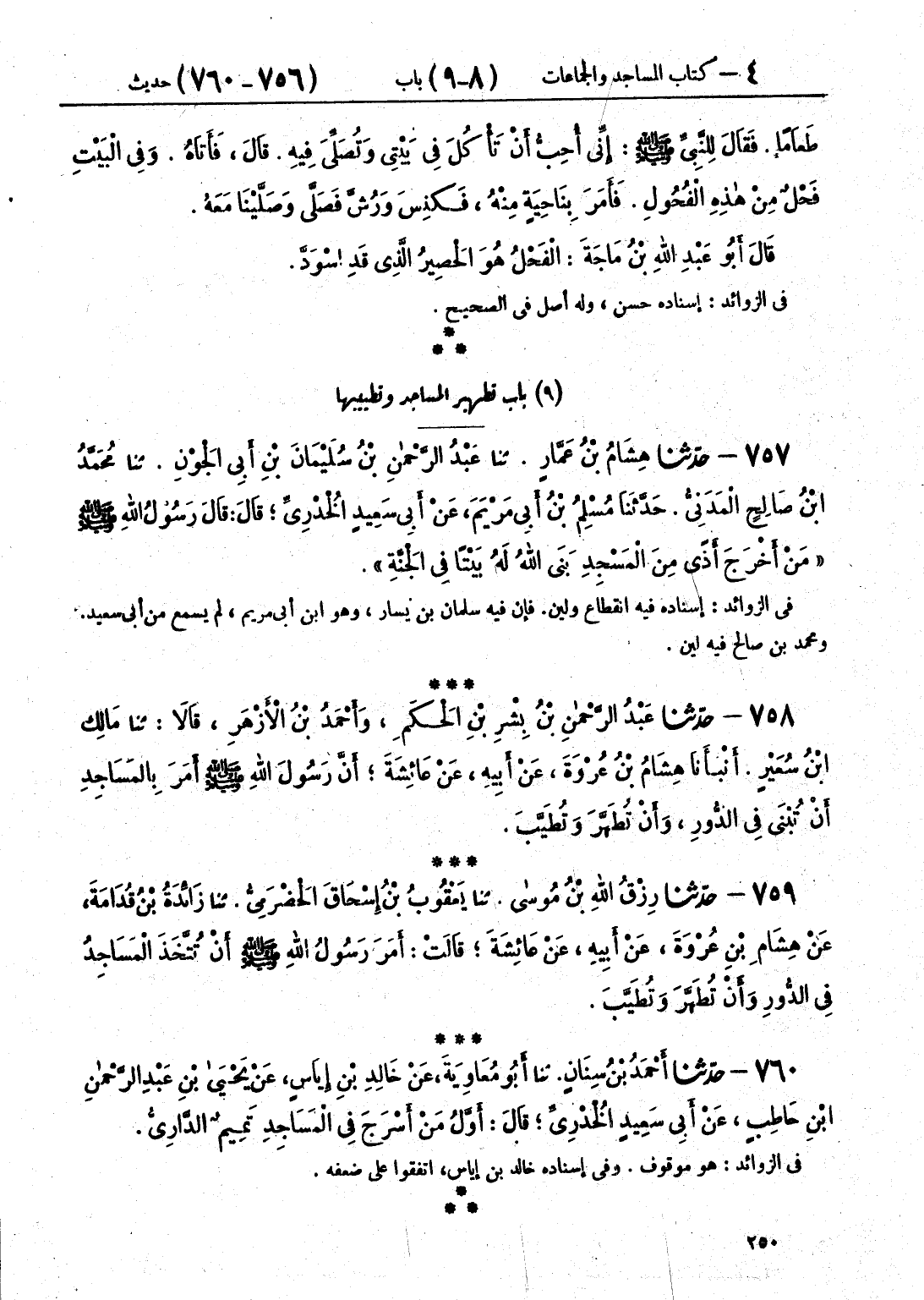 759 - حَدَّثَنَا رِزْقُ اللَّهِ بْنُ مُوسَى قَالَ: حَدَّثَنَا يَعْقُوبُ بْنُ إِسْحَاقَ الْحَضْرَمِيُّ قَالَ: حَدَّثَنَا زَائِدَةُ بْنُ قُدَامَةَ، عَنْ هِشَامِ بْنِ عُرْوَةَ، عَنْ أَبِيهِ، عَنْ عَائِشَةَ قَالَتْ: أَمَرَ رَسُولُ اللَّهِ صَلَّى اللهُ عَلَيْهِ وَسَلَّمَ «أَنْ §تُتَّخَذَ الْمَسَاجِدُ فِي الدُّورِ، وَأَنْ تُطَهَّرَ، وَتُطَيَّبَ»