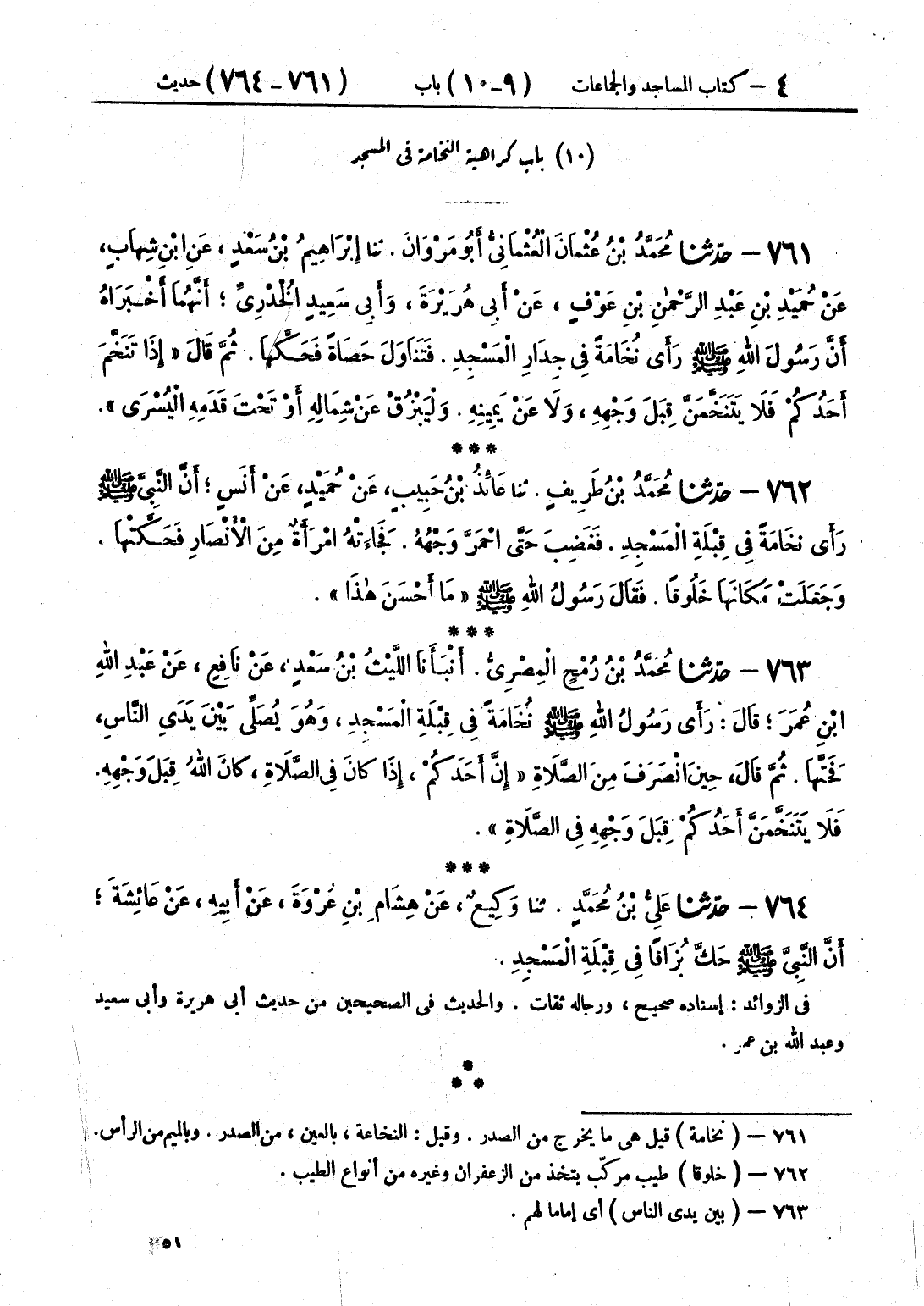 761 - حَدَّثَنَا مُحَمَّدُ بْنُ عُثْمَانَ الْعُثْمَانِيُّ أَبُو مَرْوَانَ قَالَ: حَدَّثَنَا إِبْرَاهِيمُ بْنُ سَعْدٍ، عَنِ ابْنِ شِهَابٍ، عَنْ حُمَيْدِ بْنِ عَبْدِ الرَّحْمَنِ بْنِ عَوْفٍ، عَنْ أَبِي هُرَيْرَةَ، وَأَبِي سَعِيدٍ الْخُدْرِيِّ، أَنَّهُمَا أَخْبَرَاهُ أَنَّ رَسُولَ اللَّهِ صَلَّى اللهُ عَلَيْهِ وَسَلَّمَ رَأَى نُخَامَةً فِي جِدَارِ الْمَسْجِدِ، فَتَنَاوَلَ حَصَاةً، فَحَكَّهَا، ثُمَّ قَالَ: «§إِذَا تَنَخَّمَ أَحَدُكُمْ، فَلَا يَتَنَخَّمَنَّ قِبَلَ وَجْهِهِ، وَلَا عَنْ يَمِينِهِ، وَلْيَبْزُقْ عَنْ شِمَالِهِ، أَوْ تَحْتَ قَدَمِهِ الْيُسْرَى»