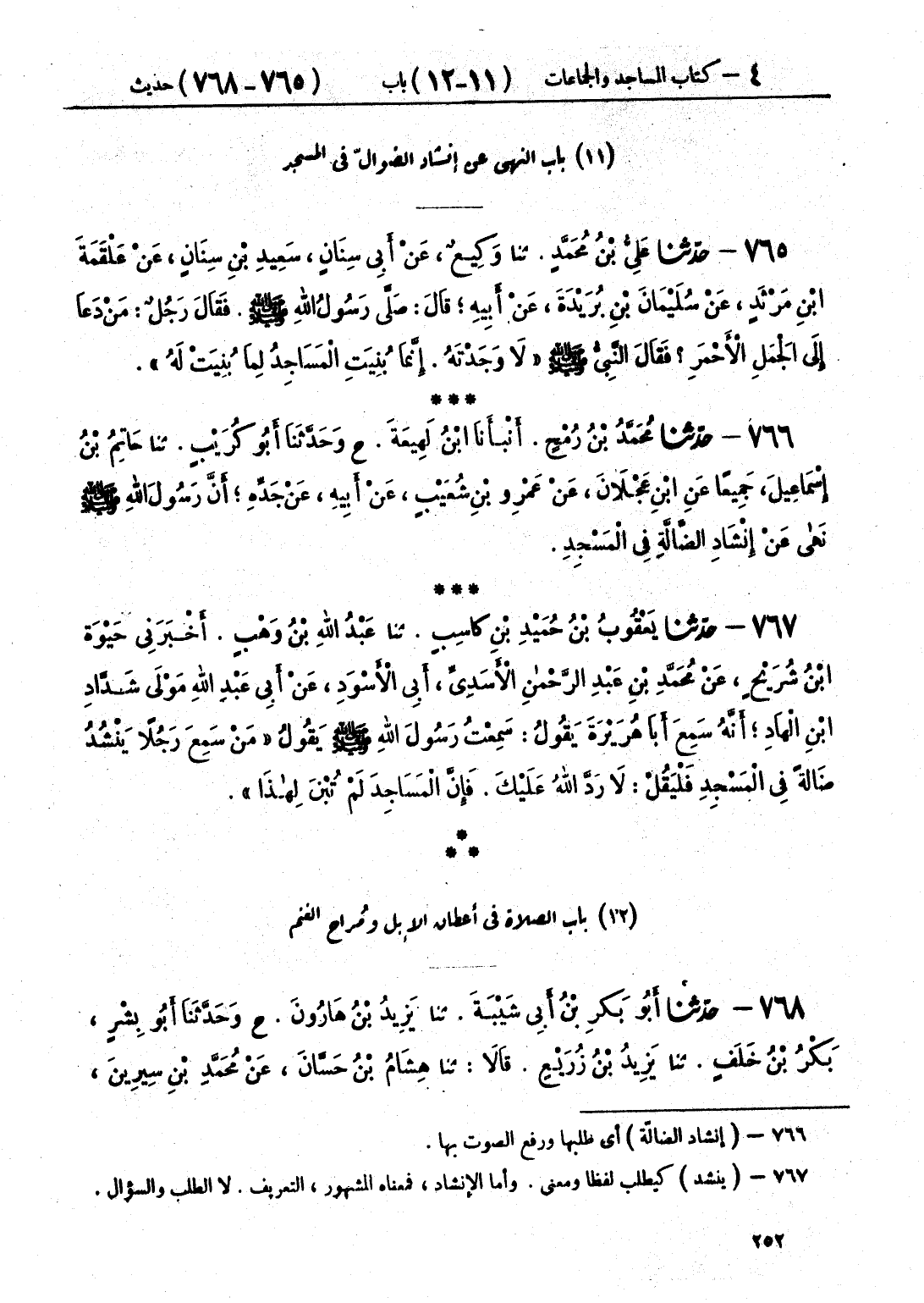 766 - حَدَّثَنَا مُحَمَّدُ بْنُ رُمْحٍ قَالَ: أَنْبَأَنَا ابْنُ لَهِيعَةَ، ح وَحَدَّثَنَا أَبُو كُرَيْبٍ قَالَ: حَدَّثَنَا حَاتِمُ بْنُ إِسْمَاعِيلَ، جَمِيعًا، عَنِ ابْنِ عَجْلَانَ، عَنْ عَمْرِو بْنِ شُعَيْبٍ، عَنْ أَبِيهِ، عَنْ جَدِّهِ أَنَّ رَسُولَ اللَّهِ صَلَّى اللهُ عَلَيْهِ وَسَلَّمَ، «§نَهَى عَنْ إِنْشَادِ الضَّالَّةِ فِي الْمَسْجِدِ»