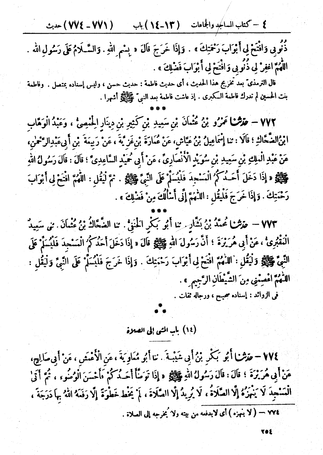 773 - حَدَّثَنَا مُحَمَّدُ بْنُ بَشَّارٍ قَالَ: حَدَّثَنَا أَبُو بَكْرٍ الْحَنَفِيُّ قَالَ: حَدَّثَنَا الضَّحَّاكُ بْنُ عُثْمَانَ قَالَ: حَدَّثَنِي سَعِيدٌ الْمَقْبُرِيُّ، عَنْ أَبِي هُرَيْرَةَ، أَنَّ رَسُولَ اللَّهِ صَلَّى اللهُ عَلَيْهِ وَسَلَّمَ قَالَ: " §إِذَا دَخَلَ أَحَدُكُمُ الْمَسْجِدَ، فَلْيُسَلِّمْ عَلَى النَّبِيِّ صَلَّى اللهُ عَلَيْهِ وَسَلَّمَ، وَلْيَقُلْ: اللَّهُمَّ افْتَحْ لِي أَبْوَابَ رَحْمَتِكَ، وَإِذَا خَرَجَ، فَلْيُسَلِّمْ عَلَى النَّبِيِّ صَلَّى اللهُ عَلَيْهِ وَسَلَّمَ، وَلْيَقُلْ: اللَّهُمَّ اعْصِمْنِي مِنَ الشَّيْطَانِ الرَّجِيمِ "