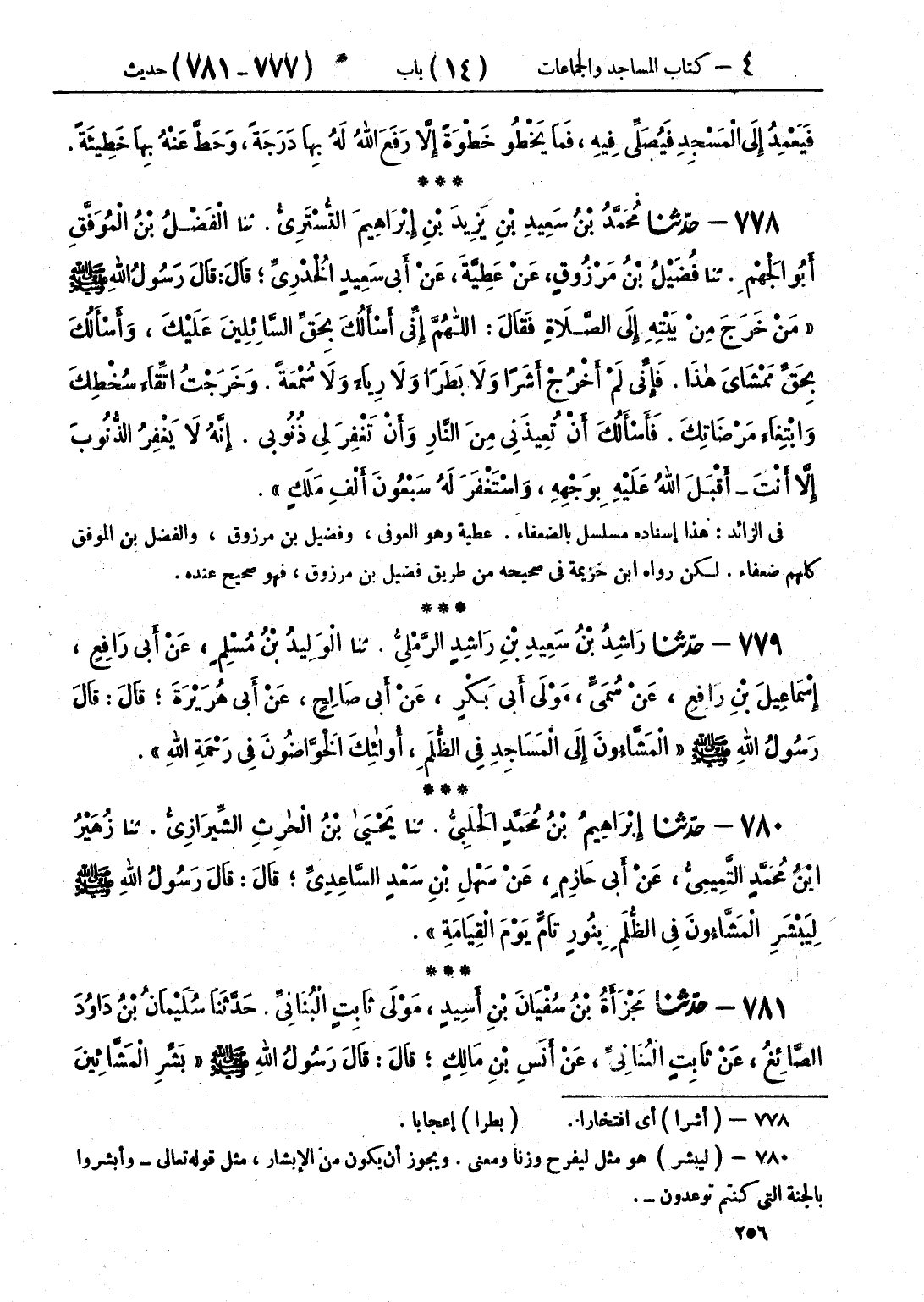 779 - حَدَّثَنَا رَاشِدُ بْنُ سَعِيدِ بْنِ رَاشِدٍ الرَّمْلِيُّ قَالَ: حَدَّثَنَا الْوَلِيدُ بْنُ مُسْلِمٍ، عَنْ أَبِي رَافِعٍ إِسْمَاعِيلَ بْنِ رَافِعٍ، عَنْ سُمَيٍّ مَوْلَى أَبِي بَكْرٍ، عَنْ أَبِي صَالِحٍ، عَنْ أَبِي هُرَيْرَةَ، قَالَ: قَالَ رَسُولُ اللَّهِ صَلَّى اللهُ عَلَيْهِ وَسَلَّمَ: «§الْمَشَّاءُونَ إِلَى الْمَسَاجِدِ فِي الظُّلَمِ، أُولَئِكَ الْخَوَّاضُونَ فِي رَحْمَةِ اللَّهِ»