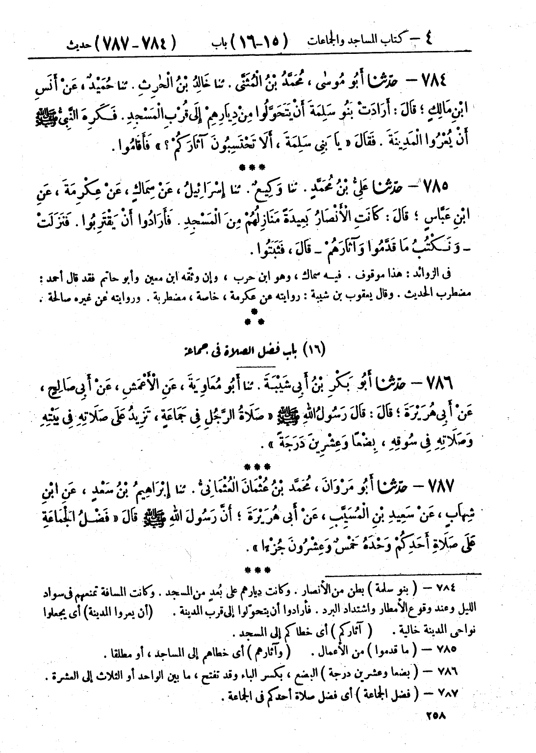 784 - حَدَّثَنَا أَبُو مُوسَى مُحَمَّدُ بْنُ الْمُثَنَّى قَالَ: حَدَّثَنَا خَالِدُ بْنُ الْحَارِثِ قَالَ: حَدَّثَنَا حُمَيْدٌ، عَنْ أَنَسِ بْنِ مَالِكٍ، قَالَ: أَرَادَتْ بَنُو سَلِمَةَ أَنْ يَتَحَوَّلُوا مِنْ دِيَارِهِمْ إِلَى قُرْبِ الْمَسْجِدِ، فَكَرِهَ النَّبِيُّ صَلَّى اللهُ عَلَيْهِ وَسَلَّمَ أَنْ يُعْرُوا الْمَدِينَةَ، فَقَالَ: «يَا بَنِي سَلِمَةَ، §أَلَا تَحْتَسِبُونَ آثَارَكُمْ؟» فَأَقَامُوا