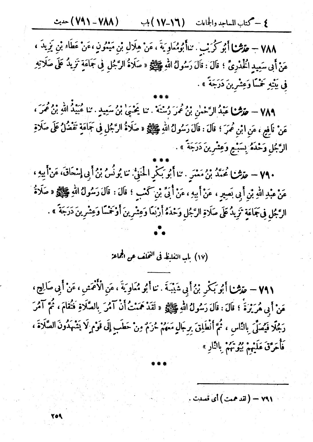 791 - حَدَّثَنَا أَبُو بَكْرِ بْنُ أَبِي شَيْبَةَ قَالَ: حَدَّثَنَا أَبُو مُعَاوِيَةَ، عَنِ الْأَعْمَشِ، عَنْ أَبِي صَالِحٍ، عَنْ أَبِي هُرَيْرَةَ، قَالَ: قَالَ رَسُولُ اللَّهِ صَلَّى اللهُ عَلَيْهِ وَسَلَّمَ: «§لَقَدْ هَمَمْتُ أَنْ آمُرَ بِالصَّلَاةِ، فَتُقَامَ، ثُمَّ آمُرَ رَجُلًا، فَيُصَلِّيَ بِالنَّاسِ، ثُمَّ أَنْطَلِقَ بِرِجَالٍ مَعَهُمْ حُزَمٌ مِنْ حَطَبٍ إِلَى قَوْمٍ لَا يَشْهَدُونَ الصَّلَاةَ، فَأُحَرِّقَ عَلَيْهِمْ بُيُوتَهُمْ بِالنَّارِ»