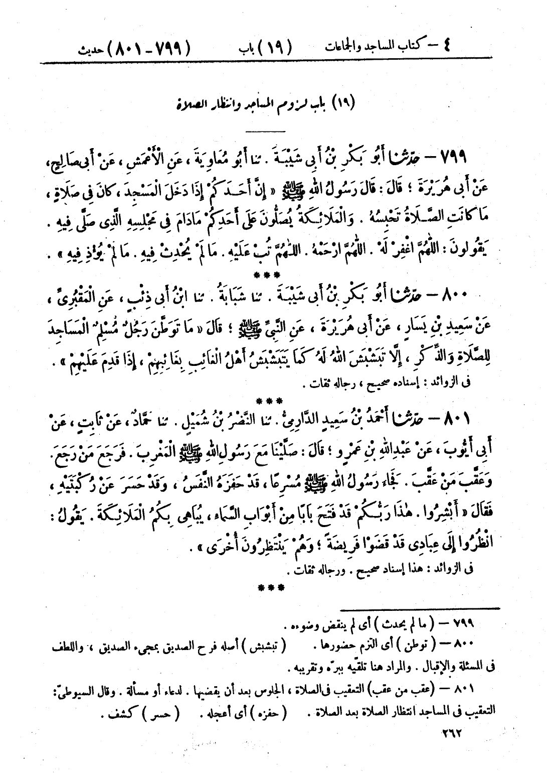 800 - حَدَّثَنَا أَبُو بَكْرِ بْنُ أَبِي شَيْبَةَ قَالَ: حَدَّثَنَا شَبَابَةُ قَالَ: حَدَّثَنَا ابْنُ أَبِي ذِئْبٍ، عَنِ الْمَقْبُرِيِّ، عَنْ سَعِيدِ بْنِ يَسَارٍ، عَنْ أَبِي هُرَيْرَةَ، عَنِ النَّبِيِّ صَلَّى اللهُ عَلَيْهِ وَسَلَّمَ، قَالَ: «§مَا تَوَطَّنَ رَجُلٌ مُسْلِمٌ الْمَسَاجِدَ لِلصَّلَاةِ وَالذِّكْرِ، إِلَّا تَبَشْبَشَ اللَّهُ لَهُ، كَمَا يَتَبَشْبَشُ أَهْلُ الْغَائِبِ بِغَائِبِهِمْ إِذَا قَدِمَ عَلَيْهِمْ»