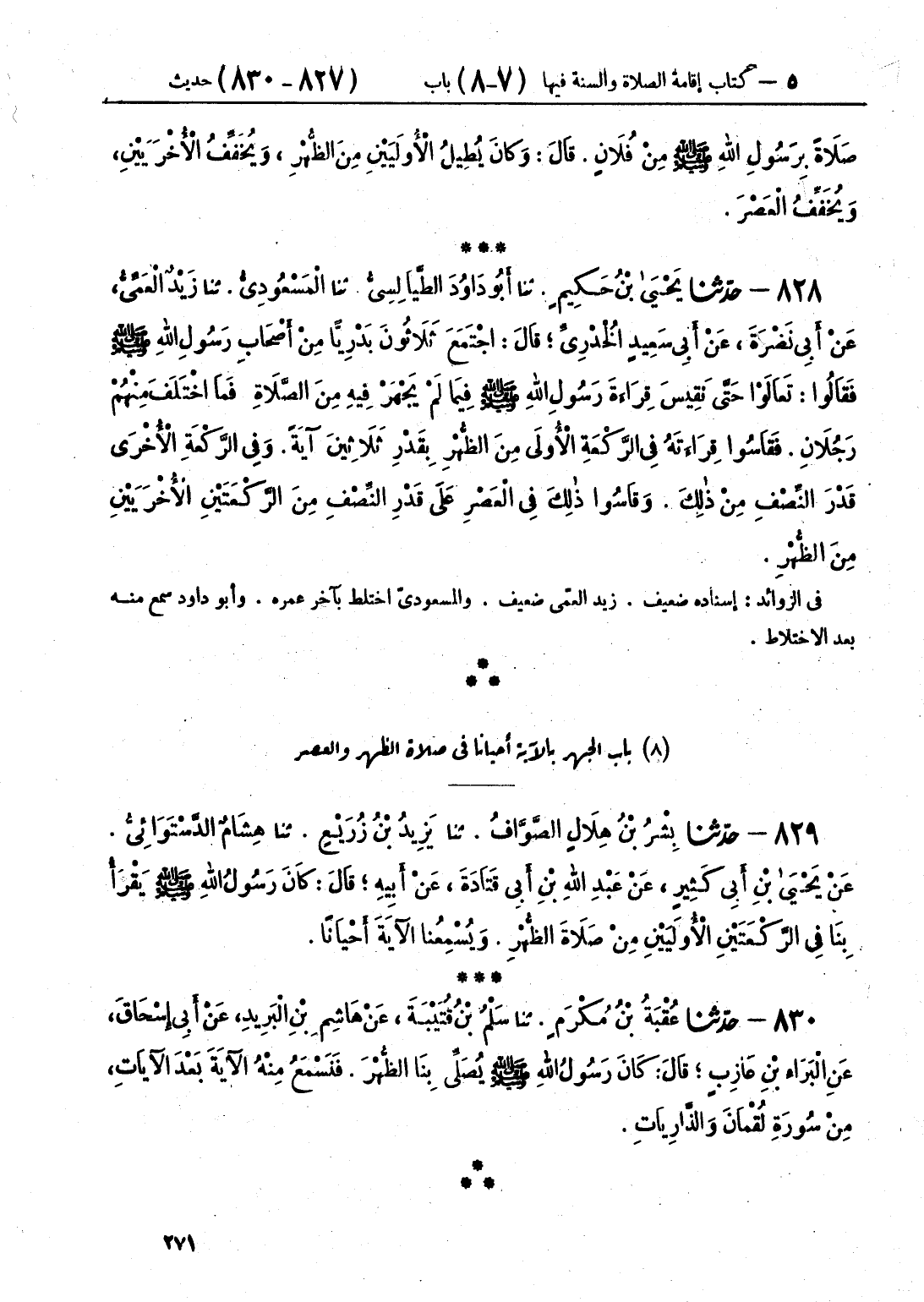 830 - حَدَّثَنَا عُقْبَةُ بْنُ مُكْرَمٍ قَالَ: حَدَّثَنَا سَلْمُ بْنُ قُتَيْبَةَ، عَنْ هَاشِمِ بْنِ الْبَرِيدِ، عَنْ أَبِي إِسْحَاقَ، عَنِ الْبَرَاءِ بْنِ عَازِبٍ، قَالَ: «كَانَ رَسُولُ اللَّهِ صَلَّى اللهُ عَلَيْهِ وَسَلَّمَ §يُصَلِّي بِنَا الظُّهْرَ، فَنَسْمَعُ مِنْهُ الْآيَةَ بَعْدَ الْآيَاتِ، مِنْ سُورَةِ لُقْمَانَ، وَالذَّارِيَاتِ»