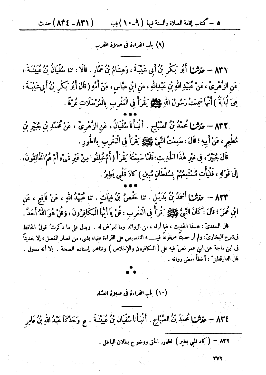 831 - حَدَّثَنَا أَبُو بَكْرِ بْنُ أَبِي شَيْبَةَ وَهِشَامُ بْنُ عَمَّارٍ، قَالَا: حَدَّثَنَا سُفْيَانُ بْنُ عُيَيْنَةَ، عَنِ الزُّهْرِيِّ، عَنْ عُبَيْدِ اللَّهِ بْنِ عَبْدِ اللَّهِ، عَنِ ابْنِ عَبَّاسٍ، عَنْ أُمِّهِ - قَالَ أَبُو بَكْرِ بْنُ أَبِي شَيْبَةَ هِيَ لُبَابَةُ أَنَّهَا سَمِعَتْ رَسُولَ اللَّهِ صَلَّى اللهُ عَلَيْهِ وَسَلَّمَ «§يَقْرَأُ فِي الْمَغْرِبِ بِالْمُرْسَلَاتِ عُرْفًا»