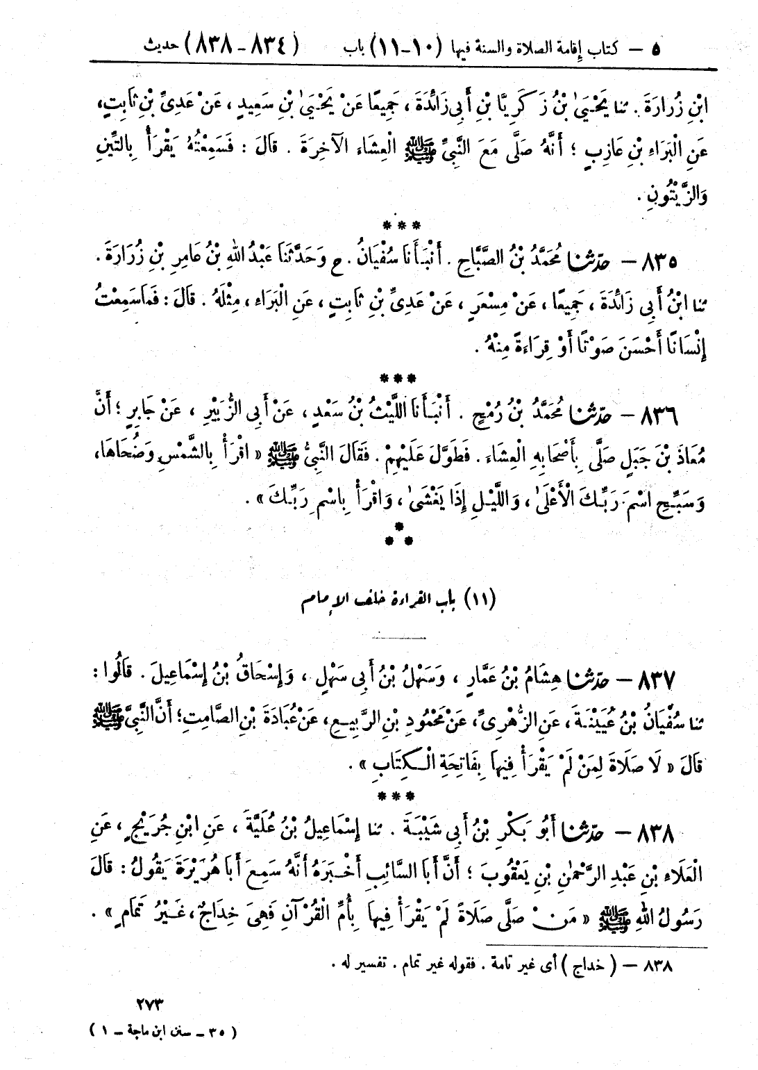 837 - حَدَّثَنَا هِشَامُ بْنُ عَمَّارٍ، وَسَهْلُ بْنُ أَبِي سَهْلٍ، وَإِسْحَاقُ بْنُ إِسْمَاعِيلَ، قَالُوا: حَدَّثَنَا سُفْيَانُ بْنُ عُيَيْنَةَ، عَنِ الزُّهْرِيِّ، عَنْ مَحْمُودِ بْنِ الرَّبِيعِ، عَنْ عُبَادَةَ بْنِ الصَّامِتِ، أَنَّ النَّبِيَّ صَلَّى اللهُ عَلَيْهِ وَسَلَّمَ قَالَ: «§لَا صَلَاةَ لِمَنْ لَمْ يَقْرَأْ فِيهَا بِفَاتِحَةِ الْكِتَابِ»
