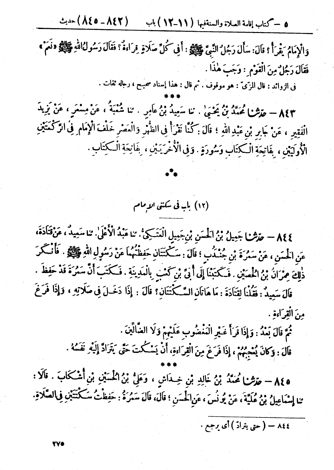 844 - حَدَّثَنَا جَمِيلُ بْنُ الْحَسَنِ بْنِ جَمِيلٍ الْعَتَكِيُّ قَالَ: حَدَّثَنَا عَبْدُ الْأَعْلَى قَالَ: حَدَّثَنَا سَعِيدٌ، عَنْ قَتَادَةَ، عَنِ الْحَسَنِ، عَنْ سَمُرَةَ بْنِ جُنْدَبٍ، قَالَ: «سَكْتَتَانِ حَفِظْتُهُمَا عَنْ رَسُولِ اللَّهِ صَلَّى اللهُ عَلَيْهِ وَسَلَّمَ» فَأَنْكَرَ ذَلِكَ عِمْرَانُ بْنُ الْحُصَيْنِ، فَكَتَبْنَا إِلَى أُبَيِّ بْنِ كَعْبٍ بِالْمَدِينَةِ، فَكَتَبَ أَنَّ سَمُرَةَ قَدْ حَفِظَ. قَالَ سَعِيدٌ: فَقُلْنَا لِقَتَادَةَ: §مَا هَاتَانِ السَّكْتَتَانِ؟ قَالَ: " إِذَا دَخَلَ فِي صَلَاتِهِ، وَإِذَا فَرَغَ مِنَ الْقِرَاءَةِ، ثُمَّ قَالَ بَعْدُ: وَإِذَا قَرَأَ {غَيْرِ الْمَغْضُوبِ عَلَيْهِمْ وَلَا الضَّالِّينَ} [الفاتحة: 7] قَالَ: وَكَانَ يُعْجِبُهُمْ: إِذَا فَرَغَ مِنَ الْقِرَاءَةِ أَنْ يَسْكُتَ، حَتَّى يَتَرَادَّ إِلَيْهِ نَفَسُهُ