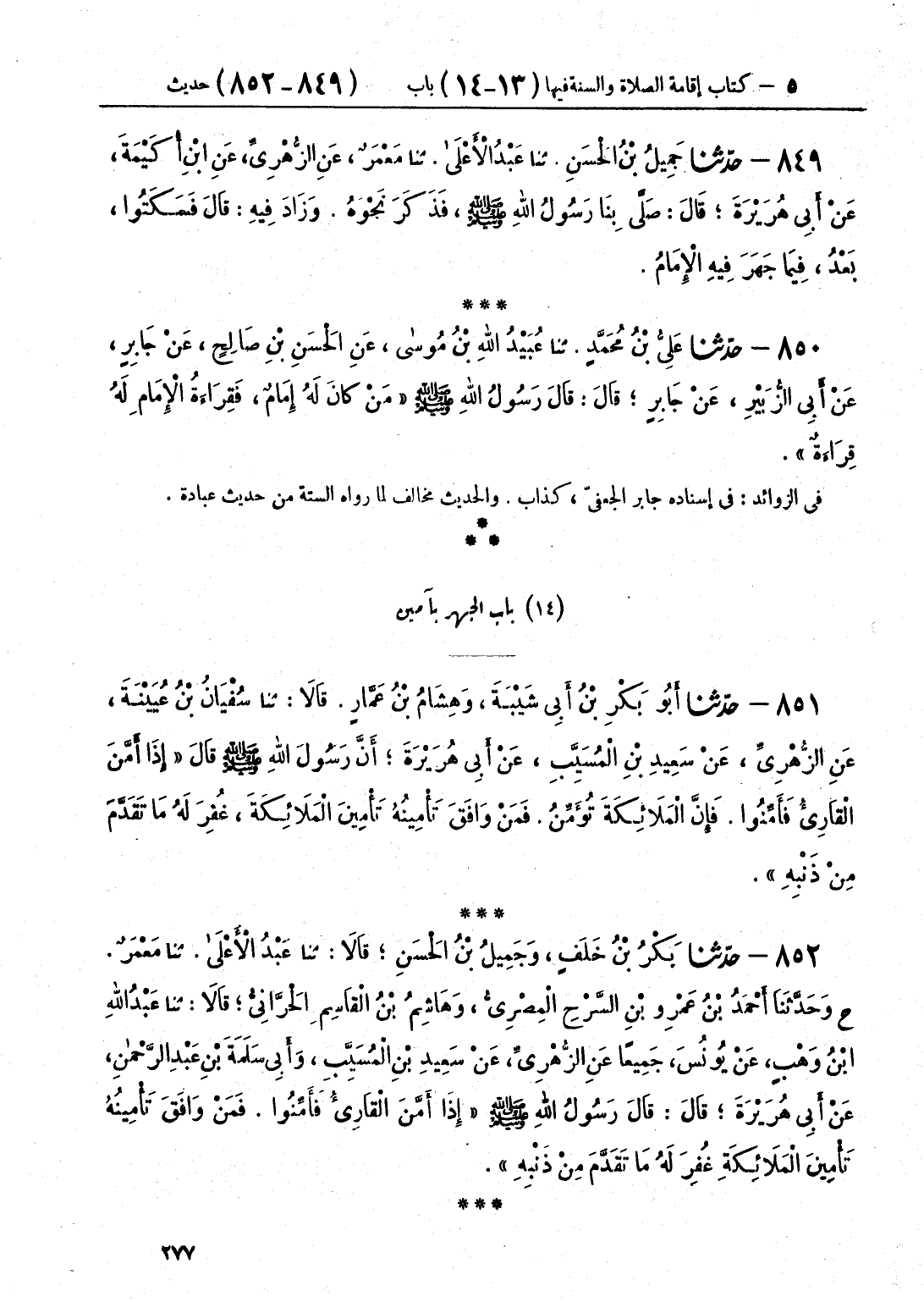 851 - حَدَّثَنَا أَبُو بَكْرِ بْنُ أَبِي شَيْبَةَ وَهِشَامُ بْنُ عَمَّارٍ، قَالَا: حَدَّثَنَا سُفْيَانُ بْنُ عُيَيْنَةَ، عَنِ الزُّهْرِيِّ، عَنْ سَعِيدِ بْنِ الْمُسَيِّبِ، عَنْ أَبِي هُرَيْرَةَ أَنَّ رَسُولَ اللَّهِ صَلَّى اللهُ عَلَيْهِ وَسَلَّمَ قَالَ: «§إِذَا أَمَّنَ الْقَارِئُ فَأَمِّنُوا، فَإِنَّ الْمَلَائِكَةَ تُؤَمِّنُ، فَمَنْ وَافَقَ تَأْمِينُهُ تَأْمِينَ الْمَلَائِكَةِ، غُفِرَ لَهُ مَا تَقَدَّمَ مِنْ ذَنْبِهِ»