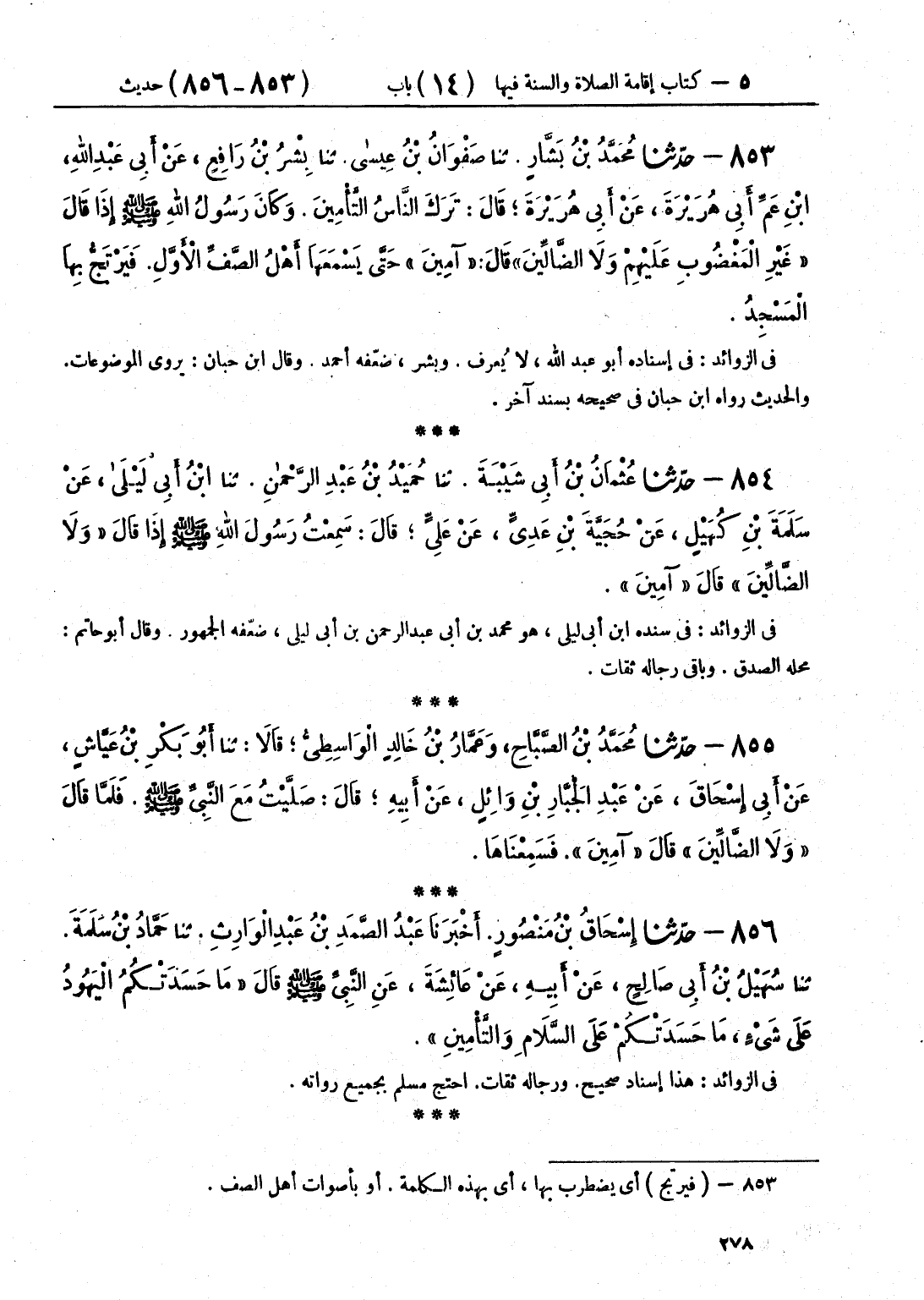 855 - حَدَّثَنَا مُحَمَّدُ بْنُ الصَّبَّاحِ وَعَمَّارُ بْنُ خَالِدٍ الْوَاسِطِيُّ، قَالَا: حَدَّثَنَا أَبُو بَكْرِ بْنُ عَيَّاشٍ، عَنْ أَبِي إِسْحَاقَ، عَنْ عَبْدِ الْجَبَّارِ بْنِ وَائِلٍ، عَنْ أَبِيهِ، قَالَ: صَلَّيْتُ مَعَ النَّبِيِّ صَلَّى اللهُ عَلَيْهِ وَسَلَّمَ، فَلَمَّا قَالَ: «§وَلَا الضَّالِّينَ» قَالَ «آمِينَ» فَسَمِعْنَاهَا