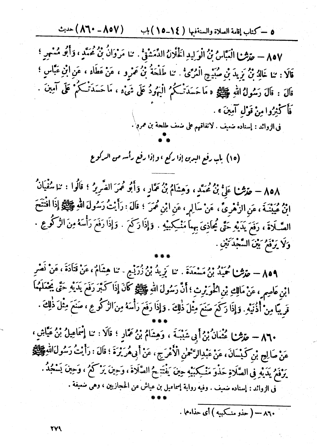 860 - حَدَّثَنَا عُثْمَانُ بْنُ أَبِي شَيْبَةَ وَهِشَامُ بْنُ عَمَّارٍ، قَالَا: حَدَّثَنَا إِسْمَاعِيلُ بْنُ عَيَّاشٍ، عَنْ صَالِحِ بْنِ كَيْسَانَ، عَنْ عَبْدِ الرَّحْمَنِ الْأَعْرَجِ، عَنْ أَبِي هُرَيْرَةَ، قَالَ: «رَأَيْتُ رَسُولَ اللَّهِ صَلَّى اللهُ عَلَيْهِ وَسَلَّمَ §يَرْفَعُ يَدَيْهِ فِي الصَّلَاةِ حَذْوَ مَنْكِبَيْهِ حِينَ يَفْتَتِحُ الصَّلَاةَ، وَحِينَ يَرْكَعُ، وَحِينَ يَسْجُدُ»