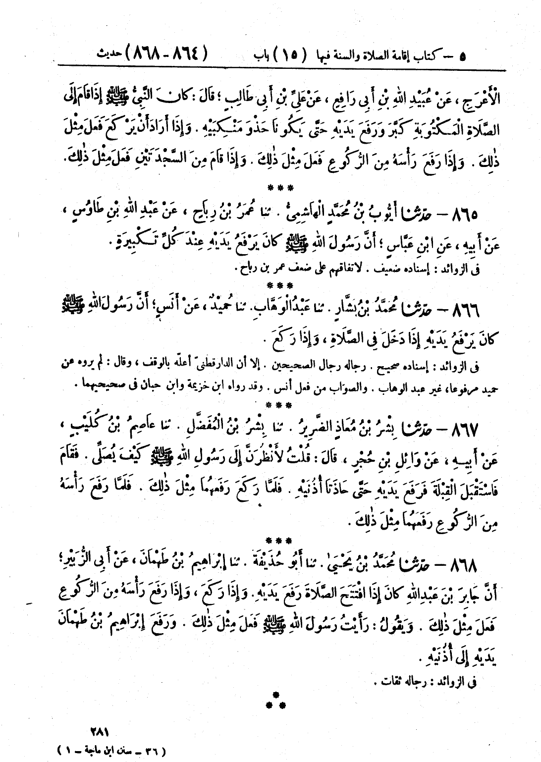 867 - حَدَّثَنَا بِشْرُ بْنُ مُعَاذٍ الضَّرِيرُ قَالَ: حَدَّثَنَا بِشْرُ بْنُ الْمُفَضَّلِ قَالَ: حَدَّثَنَا عَاصِمُ بْنُ كُلَيْبٍ، عَنْ أَبِيهِ، عَنْ وَائِلِ بْنِ حُجْرٍ، قَالَ: قُلْتُ: لَأَنْظُرَنَّ إِلَى رَسُولِ اللَّهِ صَلَّى اللهُ عَلَيْهِ وَسَلَّمَ كَيْفَ يُصَلِّي، «فَقَامَ §فَاسْتَقْبَلَ الْقِبْلَةَ، فَرَفَعَ يَدَيْهِ حَتَّى حَاذَتَا أُذُنَيْهِ، فَلَمَّا رَكَعَ رَفَعَهُمَا مِثْلَ ذَلِكَ، فَلَمَّا رَفَعَ رَأْسَهُ مِنَ الرُّكُوعِ رَفَعَهُمَا مِثْلَ ذَلِكَ»