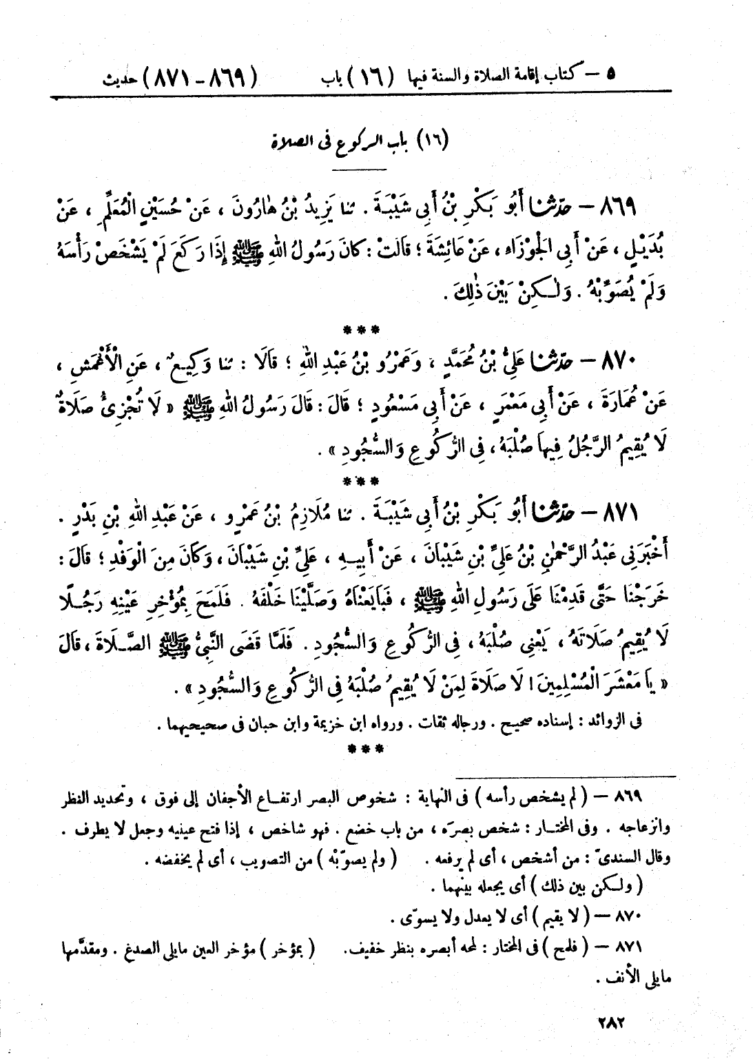 871 - حَدَّثَنَا أَبُو بَكْرِ بْنُ أَبِي شَيْبَةَ قَالَ: حَدَّثَنَا مُلَازِمُ بْنُ عَمْرٍو، عَنْ عَبْدِ اللَّهِ بْنِ بَدْرٍ قَالَ: أَخْبَرَنِي عَبْدُ الرَّحْمَنِ بْنُ عَلِيِّ بْنِ شَيْبَانَ، عَنْ أَبِيهِ عَلِيِّ بْنِ شَيْبَانَ، وَكَانَ مِنَ الْوَفْدِ، قَالَ: خَرَجْنَا إِلَى رَسُولِ اللَّهِ صَلَّى اللهُ عَلَيْهِ وَسَلَّمَ، فَبَايَعْنَاهُ وَصَلَّيْنَا خَلْفَهُ، فَلَمَحَ بِمُؤْخِرِ عَيْنِهِ رَجُلًا، لَا يُقِيمُ صَلَاتَهُ، - يَعْنِي صُلْبَهُ - فِي الرُّكُوعِ وَالسُّجُودِ، فَلَمَّا قَضَى النَّبِيُّ صَلَّى اللهُ عَلَيْهِ وَسَلَّمَ الصَّلَاةَ، قَالَ: «يَا مَعْشَرَ الْمُسْلِمِينَ §لَا صَلَاةَ لِمَنْ لَا يُقِيمُ صُلْبَهُ فِي الرُّكُوعِ وَالسُّجُودِ»