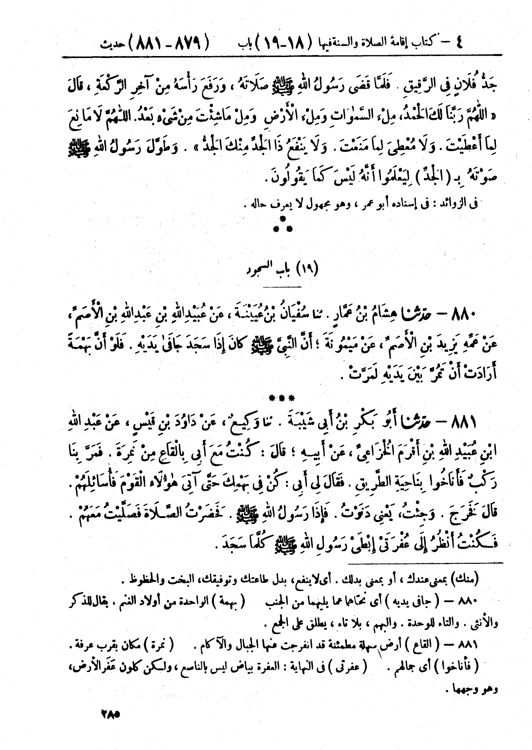 881 - حَدَّثَنَا أَبُو بَكْرِ بْنُ أَبِي شَيْبَةَ قَالَ: حَدَّثَنَا وَكِيعٌ، عَنْ دَاوُدَ بْنِ قَيْسٍ، عَنْ عُبَيْدِ اللَّهِ بْنِ عَبْدِ اللَّهِ بْنِ أَقْرَمَ الْخُزَاعِيِّ، عَنْ أَبِيهِ، قَالَ: كُنْتُ مَعَ أَبِي بِالْقَاعِ مِنْ نَمِرَةَ، فَمَرَّ بِنَا رَكْبٌ، فَأَنَاخُوا بِنَاحِيَةِ الطَّرِيقِ، فَقَالَ لِي أَبِي: كُنْ فِي بَهْمِكَ حَتَّى آتِيَ هَؤُلَاءِ الْقَوْمَ فَأُسَائِلَهُمْ، قَالَ: فَخَرَجَ، وَجِئْتُ، يَعْنِي دَنَوْتُ، فَإِذَا رَسُولُ اللَّهِ صَلَّى اللهُ عَلَيْهِ وَسَلَّمَ، فَحَضَرْتُ الصَّلَاةَ، فَصَلَّيْتُ مَعَهُمْ، فَكُنْتُ §أَنْظُرُ إِلَى عُفْرَتَيْ إِبْطَيْ رَسُولِ اللَّهِ صَلَّى اللهُ عَلَيْهِ وَسَلَّمَ كُلَّمَا سَجَدَ " قَالَ ابْنُ مَاجَةَ: النَّاسُ يَقُولُونَ: عُبَيْدُ اللَّهِ بْنُ عَبْدِ اللَّهِ، وَقَالَ أَبُو بَكْرِ بْنُ أَبِي شَيْبَةَ: يَقُولُ النَّاسُ: عَبْدُ اللَّهِ بْنُ عُبَيْدِ اللَّهِ حَدَّثَنَا مُحَمَّدُ بْنُ بَشَّارٍ قَالَ: حَدَّثَنَا عَبْدُ الرَّحْمَنِ بْنُ مَهْدِيٍّ، وَصَفْوَانُ بْنُ عِيسَى، وَأَبُو دَاوُدَ، قَالُوا: حَدَّثَنَا دَاوُدُ بْنُ قَيْسٍ، عَنْ عُبَيْدِ اللَّهِ بْنِ عَبْدِ اللَّهِ بْنِ أَقْرَمَ، عَنْ أَبِيهِ، عَنِ النَّبِيِّ صَلَّى اللهُ عَلَيْهِ وَسَلَّمَ نَحْوَهُ