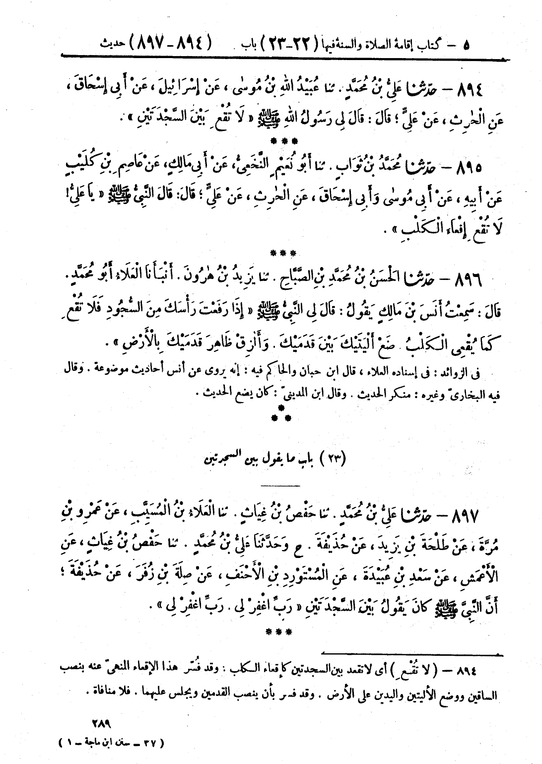 894 - حَدَّثَنَا عَلِيُّ بْنُ مُحَمَّدٍ قَالَ: حَدَّثَنَا عُبَيْدُ اللَّهِ بْنُ مُوسَى، عَنْ إِسْرَائِيلَ، عَنْ أَبِي إِسْحَاقَ، عَنِ الْحَارِثِ، عَنْ عَلِيٍّ قَالَ: قَالَ لِي رَسُولُ اللَّهِ صَلَّى اللهُ عَلَيْهِ وَسَلَّمَ: «§لَا تُقْعِ بَيْنَ السَّجْدَتَيْنِ»