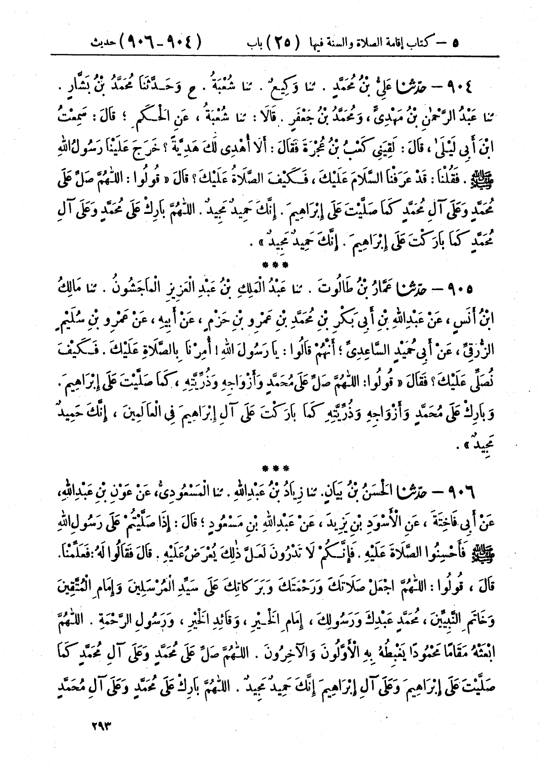 904 - حَدَّثَنَا عَلِيُّ بْنُ مُحَمَّدٍ قَالَ: حَدَّثَنَا وَكِيعٌ قَالَ: حَدَّثَنَا شُعْبَةُ، ح وَحَدَّثَنَا مُحَمَّدُ بْنُ بَشَّارٍ قَالَ: حَدَّثَنَا عَبْدُ الرَّحْمَنِ بْنُ مَهْدِيٍّ، وَمُحَمَّدُ بْنُ جَعْفَرٍ، قَالَا: حَدَّثَنَا شُعْبَةُ، عَنِ الْحَكَمِ، قَالَ: سَمِعْتُ ابْنَ أَبِي لَيْلَى، قَالَ: لَقِيَنِي كَعْبُ بْنُ عُجْرَةَ، فَقَالَ: أَلَا أُهْدِي لَكَ هَدِيَّةً؟ خَرَجَ عَلَيْنَا رَسُولُ اللَّهِ صَلَّى اللهُ عَلَيْهِ وَسَلَّمَ، فَقُلْنَا: قَدْ عَرَفْنَا السَّلَامَ عَلَيْكَ، فَكَيْفَ الصَّلَاةُ عَلَيْكَ؟ قَالَ " قُولُوا: §اللَّهُمَّ صَلِّ عَلَى مُحَمَّدٍ، وَعَلَى آلِ مُحَمَّدٍ، كَمَا صَلَّيْتَ عَلَى إِبْرَاهِيمَ، إِنَّكَ حَمِيدٌ مَجِيدٌ، اللَّهُمَّ بَارِكْ عَلَى مُحَمَّدٍ، وَعَلَى آلِ مُحَمَّدٍ، كَمَا بَارَكْتَ عَلَى إِبْرَاهِيمَ، إِنَّكَ حَمِيدٌ مَجِيدٌ "