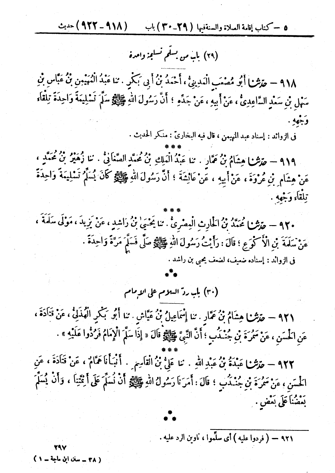 919 - حَدَّثَنَا هِشَامُ بْنُ عَمَّارٍ قَالَ: حَدَّثَنَا عَبْدُ الْمَلِكِ بْنُ مُحَمَّدٍ الصَّنْعَانِيُّ قَالَ: حَدَّثَنَا زُهَيْرُ بْنُ مُحَمَّدٍ، عَنْ هِشَامِ بْنِ عُرْوَةَ، عَنْ أَبِيهِ، عَنْ عَائِشَةَ أَنَّ رَسُولَ اللَّهِ صَلَّى اللهُ عَلَيْهِ وَسَلَّمَ «كَانَ §يُسَلِّمُ تَسْلِيمَةً وَاحِدَةً تِلْقَاءَ وَجْهِهِ»