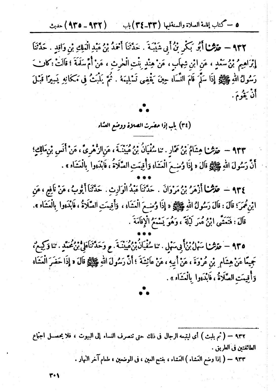 933 - حَدَّثَنَا هِشَامُ بْنُ عَمَّارٍ قَالَ: حَدَّثَنَا سُفْيَانُ بْنُ عُيَيْنَةَ، عَنِ الزُّهْرِيِّ، عَنْ أَنَسِ بْنِ مَالِكٍ أَنَّ رَسُولَ اللَّهِ صَلَّى اللهُ عَلَيْهِ وَسَلَّمَ، قَالَ: «§إِذَا وُضِعَ الْعَشَاءُ، وَأُقِيمَتِ الصَّلَاةُ، فَابْدَءُوا بِالْعَشَاءِ»