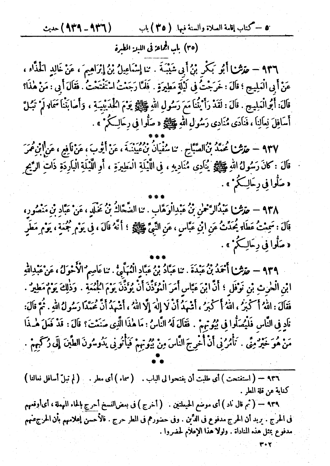 936 - حَدَّثَنَا أَبُو بَكْرِ بْنُ أَبِي شَيْبَةَ قَالَ: حَدَّثَنَا إِسْمَاعِيلُ بْنُ إِبْرَاهِيمَ، عَنْ خَالِدٍ الْحَذَّاءِ، عَنْ أَبِي قِلَابَةَ، عَنْ أَبِي الْمَلِيحِ، قَالَ: خَرَجْتُ فِي لَيْلَةٍ مَطِيرَةٍ، فَلَمَّا رَجَعْتُ اسْتَفْتَحْتُ، فَقَالَ أَبِي: مَنْ هَذَا؟ قَالَ: أَبُو الْمَلِيحِ، قَالَ: لَقَدْ رَأَيْتُنَا مَعَ رَسُولِ اللَّهِ صَلَّى اللهُ عَلَيْهِ وَسَلَّمَ يَوْمَ الْحُدَيْبِيَةِ، وَأَصَابَتْنَا سَمَاءٌ، لَمْ تَبُلَّ أَسَافِلَ نِعَالِنَا، فَنَادَى مُنَادِي رَسُولِ اللَّهِ صَلَّى اللهُ عَلَيْهِ وَسَلَّمَ «§صَلُّوا فِي رِحَالِكُمْ»