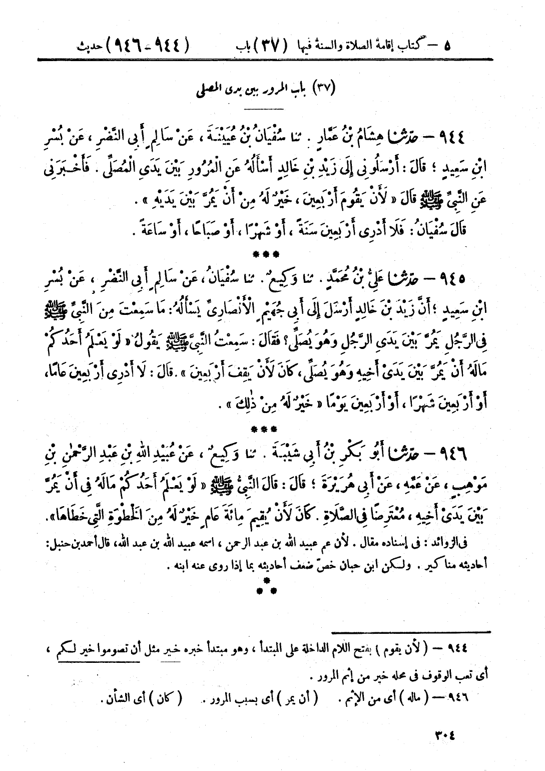 944 - حَدَّثَنَا هِشَامُ بْنُ عَمَّارٍ قَالَ: حَدَّثَنَا سُفْيَانُ بْنُ عُيَيْنَةَ، عَنْ سَالِمٍ أَبِي النَّضْرِ، عَنْ بُسْرِ بْنِ سَعِيدٍ، قَالَ: أَرْسَلُونِي إِلَى زَيْدِ بْنِ خَالِدٍ أَسْأَلُهُ عَنِ الْمُرُورِ، بَيْنَ يَدَيِ الْمُصَلِّي، فَأَخْبَرَنِي عَنِ النَّبِيِّ صَلَّى اللهُ عَلَيْهِ وَسَلَّمَ قَالَ: «§لَأَنْ يَقُومَ أَرْبَعِينَ، خَيْرٌ لَهُ مِنْ أَنْ يَمُرَّ بَيْنَ يَدَيْهِ» قَالَ سُفْيَانُ: فَلَا أَدْرِي أَرْبَعِينَ سَنَةً، أَوْ شَهْرًا، أَوْ صَبَاحًا، أَوْ سَاعَةً