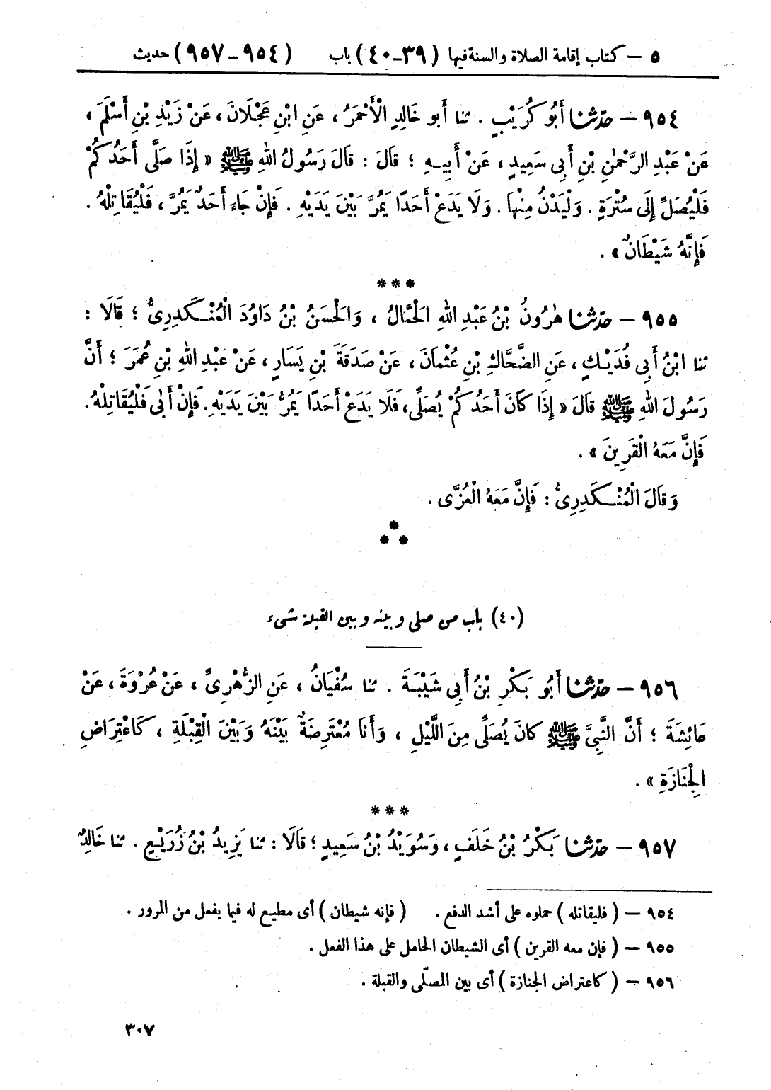 954 - حَدَّثَنَا أَبُو كُرَيْبٍ قَالَ: حَدَّثَنَا أَبُو خَالِدٍ الْأَحْمَرُ، عَنْ ابْنِ عَجْلَانَ، عَنْ زَيْدِ بْنِ أَسْلَمَ، عَنْ عَبْدِ الرَّحْمَنِ بْنِ أَبِي سَعِيدٍ، عَنْ أَبِيهِ، قَالَ: قَالَ رَسُولُ اللَّهِ صَلَّى اللهُ عَلَيْهِ وَسَلَّمَ «§إِذَا صَلَّى أَحَدُكُمْ، فَلْيُصَلِّ إِلَى سُتْرَةٍ، وَلْيَدْنُ مِنْهَا، وَلَا يَدَعْ أَحَدًا يَمُرُّ بَيْنَ يَدَيْهِ، فَإِنْ جَاءَ أَحَدٌ يَمُرُّ فَلْيُقَاتِلْهُ، فَإِنَّهُ شَيْطَانٌ»