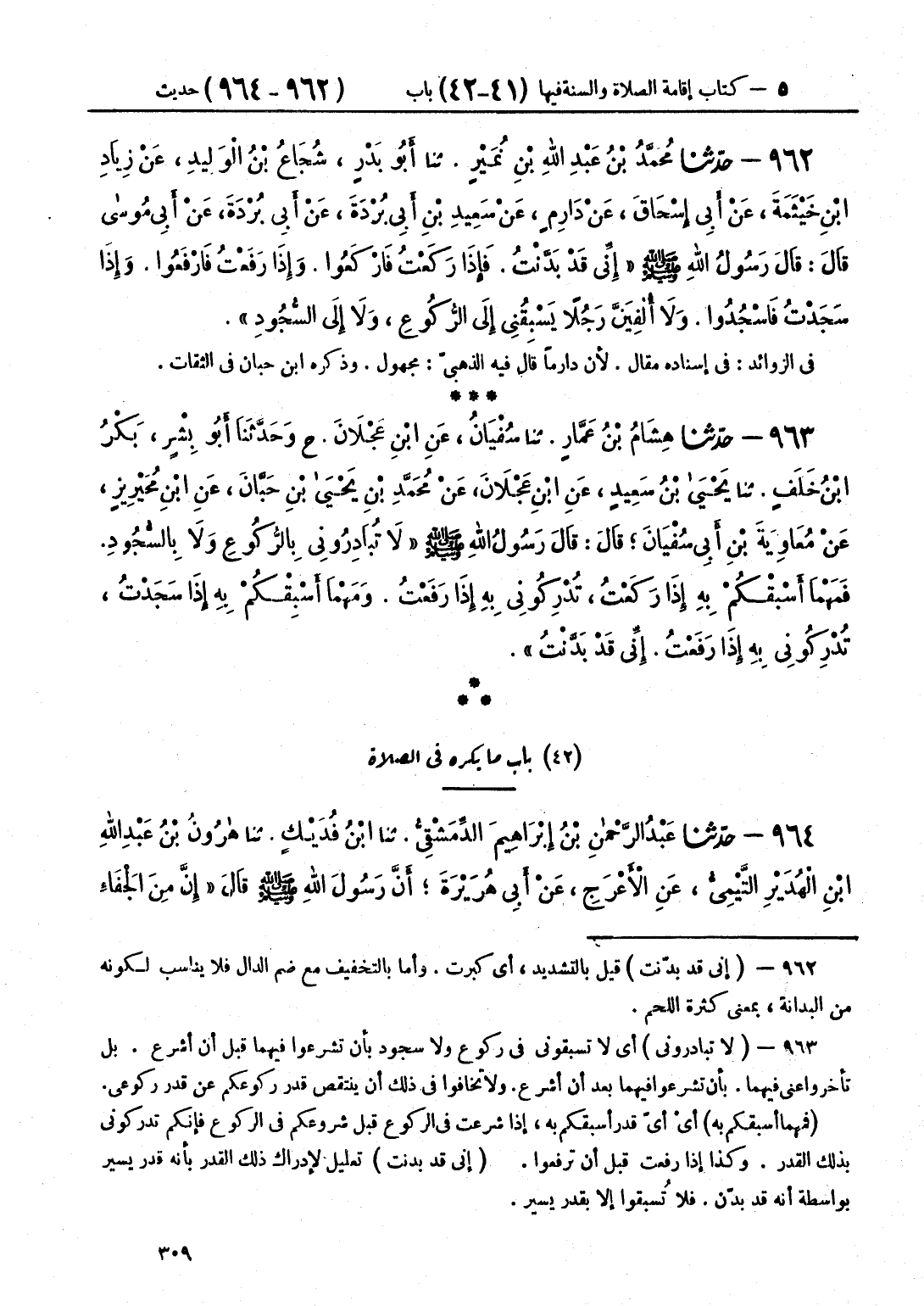 962 - حَدَّثَنَا مُحَمَّدُ بْنُ عَبْدِ اللَّهِ بْنِ نُمَيْرٍ قَالَ: حَدَّثَنَا أَبُو بَدْرٍ شُجَاعُ بْنِ الْوَلِيدِ، عَنْ زِيَادِ بْنِ خَيْثَمَةَ، عَنْ أَبِي إِسْحَاقَ، عَنْ دَارِمٍ، عَنْ سَعِيدِ بْنِ أَبِي بُرْدَةَ، عَنْ أَبِي بُرْدَةَ، عَنْ أَبِي مُوسَى، قَالَ: قَالَ رَسُولُ اللَّهِ صَلَّى اللهُ عَلَيْهِ وَسَلَّمَ: «§إِنِّي قَدْ بَدَّنْتُ، فَإِذَا رَكَعْتُ فَارْكَعُوا، وَإِذَا رَفَعْتُ فَارْفَعُوا، وَإِذَا سَجَدْتُ فَاسْجُدُوا، وَلَا أُلْفِيَنَّ رَجُلًا يَسْبِقُنِي إِلَى الرُّكُوعِ، وَلَا إِلَى السُّجُودِ»