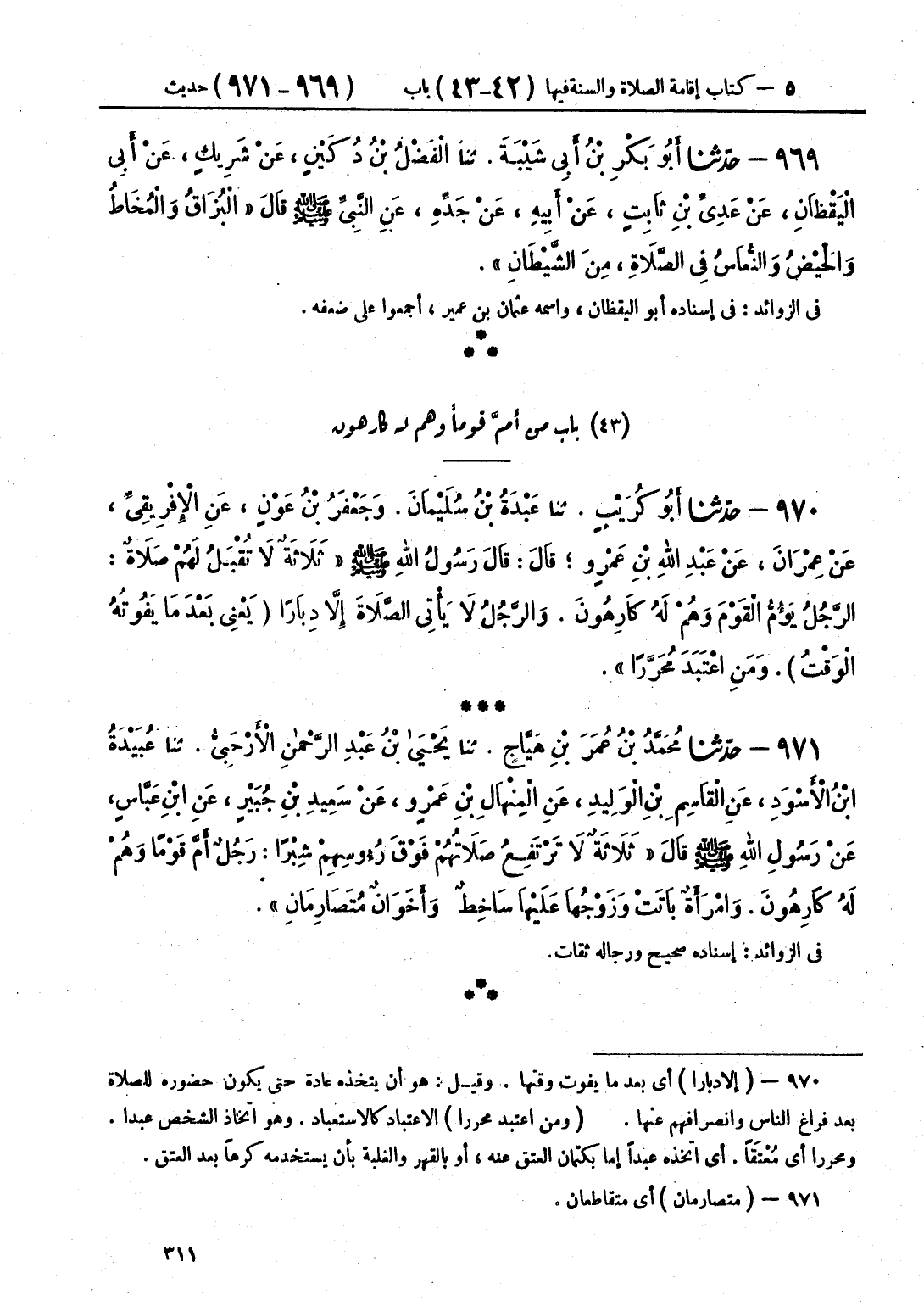 970 - حَدَّثَنَا أَبُو كُرَيْبٍ قَالَ: حَدَّثَنَا عَبْدَةُ بْنُ سُلَيْمَانَ، وَجَعْفَرُ بْنُ عَوْنٍ، عَنْ الْإِفْرِيقِيِّ، عَنْ عِمْرَانَ، عَنْ عَبْدِ اللَّهِ بْنِ عَمْرٍو، قَالَ: قَالَ رَسُولُ اللَّهِ صَلَّى اللهُ عَلَيْهِ وَسَلَّمَ: «§ثَلَاثَةٌ لَا تُقْبَلُ لَهُمْ صَلَاةٌ، الرَّجُلُ يَؤُمُّ الْقَوْمَ وَهُمْ لَهُ كَارِهُونَ، وَالرَّجُلُ لَا يَأْتِي الصَّلَاةَ إِلَّا دِبَارًا - يَعْنِي بَعْدَ مَا يَفُوتُهُ الْوَقْتُ - وَمَنْ اعْتَبَدَ، مُحَرَّرًا»