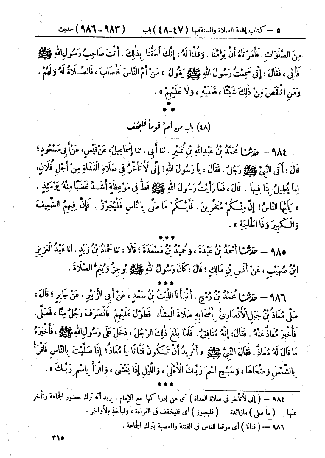 984 - حَدَّثَنَا مُحَمَّدُ بْنُ عَبْدِ اللَّهِ بْنِ نُمَيْرٍ قَالَ: حَدَّثَنَا أَبِي قَالَ: حَدَّثَنَا إِسْمَاعِيلُ، عَنْ قَيْسٍ، عَنْ أَبِي مَسْعُودٍ، قَالَ أَتَى النَّبِيَّ صَلَّى اللهُ عَلَيْهِ وَسَلَّمَ رَجُلٌ، فَقَالَ: يَا رَسُولَ اللَّهِ، إِنِّي لَأَتَأَخَّرُ فِي صَلَاةِ الْغَدَاةِ مِنْ أَجْلِ فُلَانٍ لِمَا يُطِيلُ بِنَا فِيهَا، قَالَ: فَمَا رَأَيْتُ رَسُولَ اللَّهِ صَلَّى اللهُ عَلَيْهِ وَسَلَّمَ قَطُّ فِي مَوْعِظَةٍ أَشَدَّ غَضَبًا مِنْهُ يَوْمَئِذٍ، فَقَالَ: «يَا أَيُّهَا النَّاسُ §إِنَّ مِنْكُمْ مُنَفِّرِينَ، فَأَيُّكُمْ مَا صَلَّى بِالنَّاسِ، فَلْيُجَوِّزْ؛ فَإِنَّ فِيهِمُ الضَّعِيفَ، وَالْكَبِيرَ، وَذَا الْحَاجَةِ»