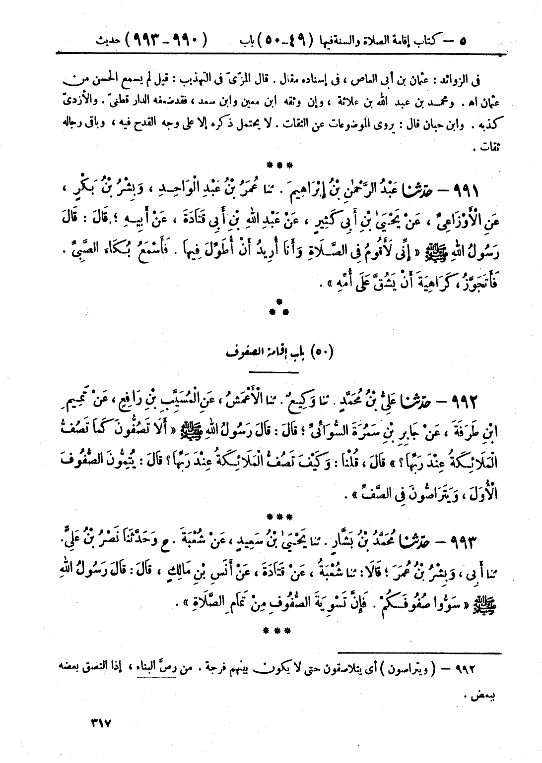 992 - حَدَّثَنَا عَلِيُّ بْنُ مُحَمَّدٍ قَالَ: حَدَّثَنَا وَكِيعٌ قَالَ: حَدَّثَنَا الْأَعْمَشُ، عَنْ الْمُسَيَّبِ بْنِ رَافِعٍ، عَنْ تَمِيمِ بْنِ طَرَفَةَ، عَنْ جَابِرِ بْنِ سَمُرَةَ السُّوَائِيِّ، قَالَ: قَالَ رَسُولُ اللَّهِ صَلَّى اللهُ عَلَيْهِ وَسَلَّمَ: «§أَلَا تَصُفُّونَ كَمَا تَصُفُّ الْمَلَائِكَةُ عِنْدَ رَبِّهَا؟» قَالَ، قُلْنَا: وَكَيْفَ تَصُفُّ الْمَلَائِكَةُ عِنْدَ رَبِّهَا؟ قَالَ: «يُتِمُّونَ الصُّفُوفَ الْأُوَلَ، وَيَتَرَاصُّونَ فِي الصَّفِّ»