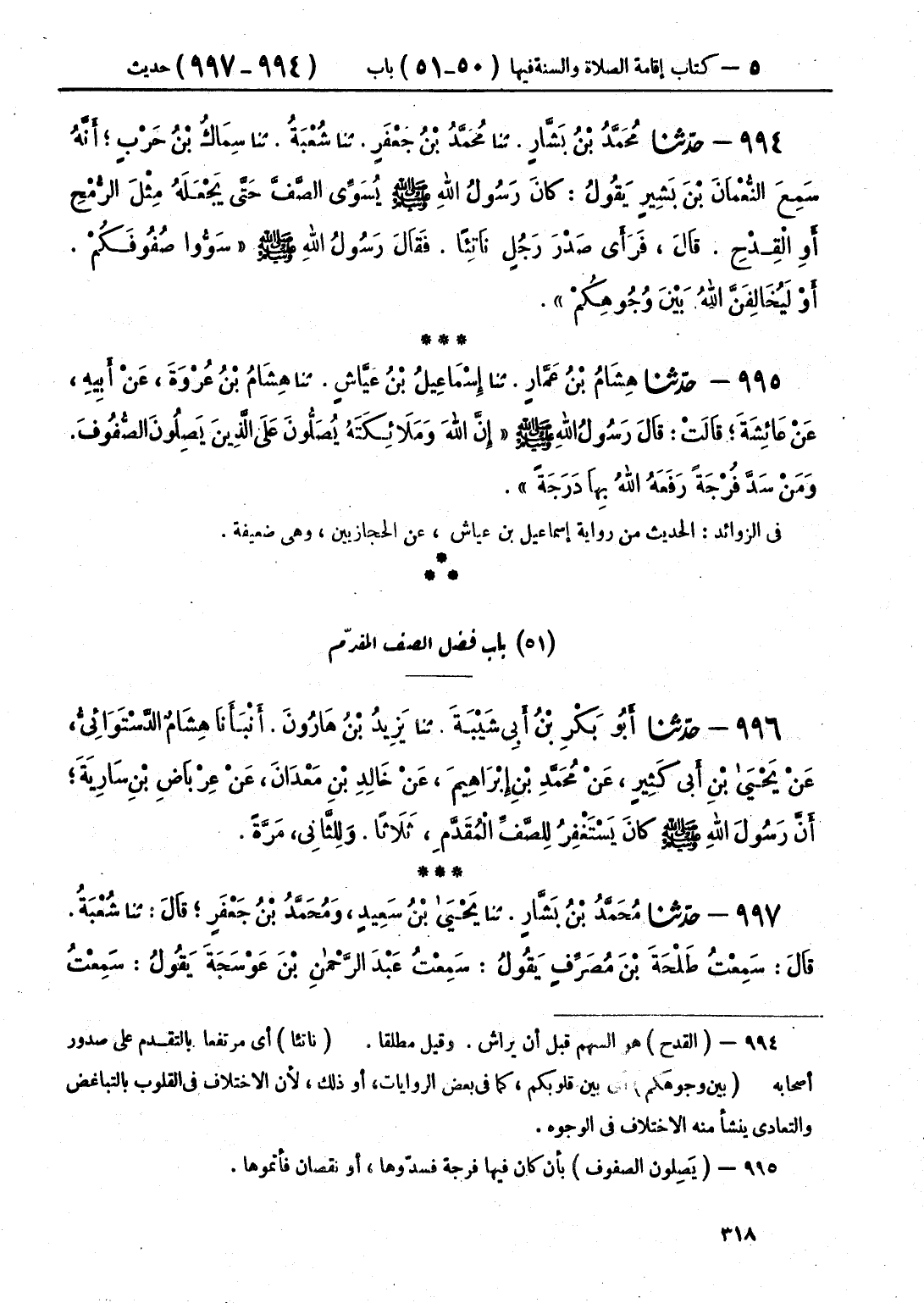 996 - حَدَّثَنَا أَبُو بَكْرِ بْنُ أَبِي شَيْبَةَ قَالَ: حَدَّثَنَا يَزِيدُ بْنُ هَارُونَ قَالَ: أَنْبَأَنَا هِشَامٌ الدَّسْتُوَائِيُّ، عَنْ يَحْيَى بْنِ أَبِي كَثِيرٍ، عَنْ مُحَمَّدِ بْنِ إِبْرَاهِيمَ، عَنْ خَالِدِ بْنِ مَعْدَانَ، عَنْ عِرْبَاضِ بْنِ سَارِيَةَ، أَنَّ رَسُولَ اللَّهِ صَلَّى اللهُ عَلَيْهِ وَسَلَّمَ كَانَ «§يَسْتَغْفِرُ لِلصَّفِّ الْمُقَدَّمِ ثَلَاثًا وَلِلثَّانِي مَرَّةً»