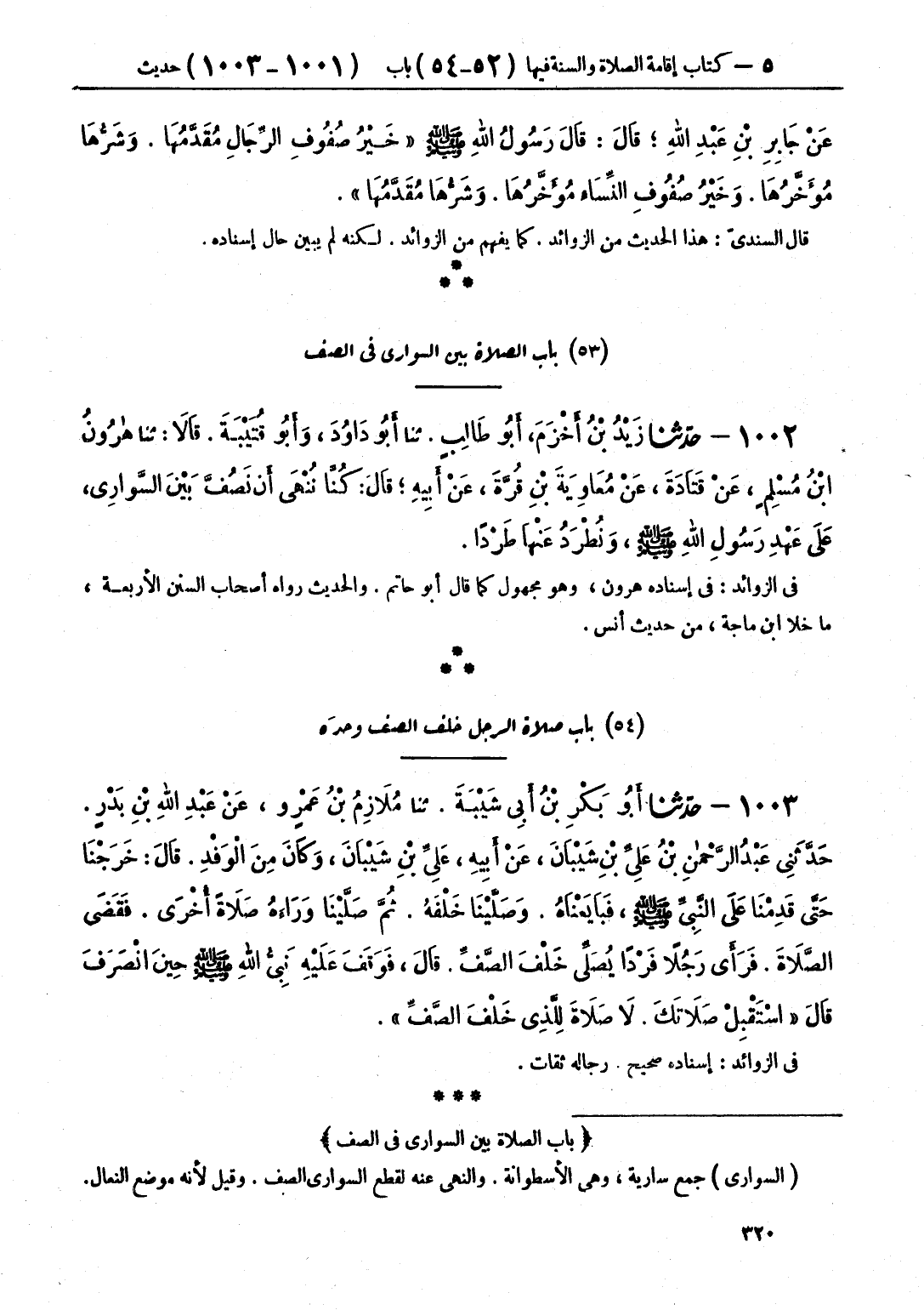1003 - حَدَّثَنَا أَبُو بَكْرِ بْنُ أَبِي شَيْبَةَ قَالَ: حَدَّثَنَا مُلَازِمُ بْنُ عَمْرٍو، عَنْ عَبْدِ اللَّهِ بْنِ بَدْرٍ قَالَ: حَدَّثَنِي عَبْدُ الرَّحْمَنِ بْنُ عَلِيِّ بْنِ شَيْبَانَ، عَنْ أَبِيهِ عَلِيِّ بْنِ شَيْبَانَ وَكَانَ مِنَ الْوَفْدِ، قَالَ: خَرَجْنَا حَتَّى قَدِمْنَا عَلَى النَّبِيِّ صَلَّى اللهُ عَلَيْهِ وَسَلَّمَ، فَبَايَعْنَاهُ، وَصَلَّيْنَا خَلْفَهُ، ثُمَّ صَلَّيْنَا وَرَاءَهُ صَلَاةً أُخْرَى، فَقَضَى الصَّلَاةَ، فَرَأَى رَجُلًا فَرْدًا يُصَلِّي خَلْفَ الصَّفِّ، قَالَ: فَوَقَفَ عَلَيْهِ نَبِيُّ اللَّهِ صَلَّى اللهُ عَلَيْهِ وَسَلَّمَ حِينَ انْصَرَفَ قَالَ: «§اسْتَقْبِلْ صَلَاتَكَ، لَا صَلَاةَ لِلَّذِي خَلْفَ الصَّفِّ»