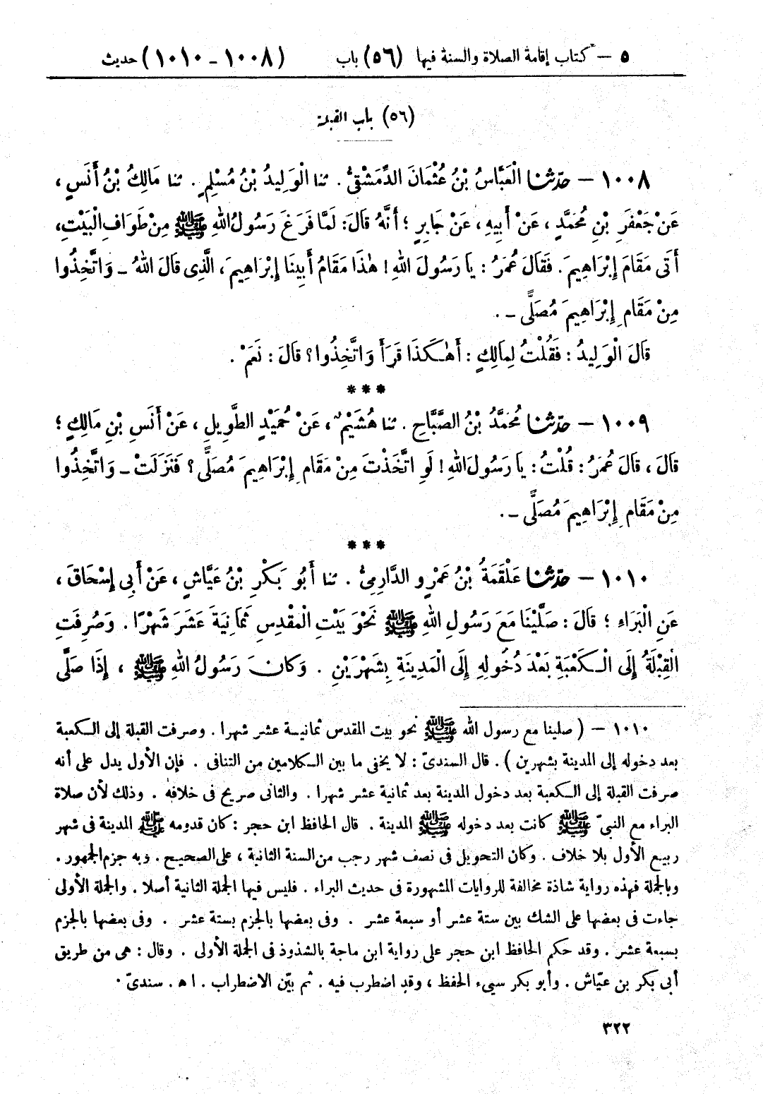 1009 - حَدَّثَنَا مُحَمَّدُ بْنُ الصَّبَّاحِ قَالَ: حَدَّثَنَا هُشَيْمٌ، عَنْ حُمَيْدٍ الطَّوِيلِ، عَنْ أَنَسِ بْنِ مَالِكٍ، قَالَ: قَالَ عُمَرُ: قُلْتُ: يَا رَسُولَ اللَّهِ «§لَوِ اتَّخَذْتَ مِنْ مَقَامِ إِبْرَاهِيمَ مُصَلًّى؟» فَنَزَلَتْ: {وَاتَّخِذُوا مِنْ مَقَامِ إِبْرَاهِيمَ مُصَلًّى} [البقرة: 125]