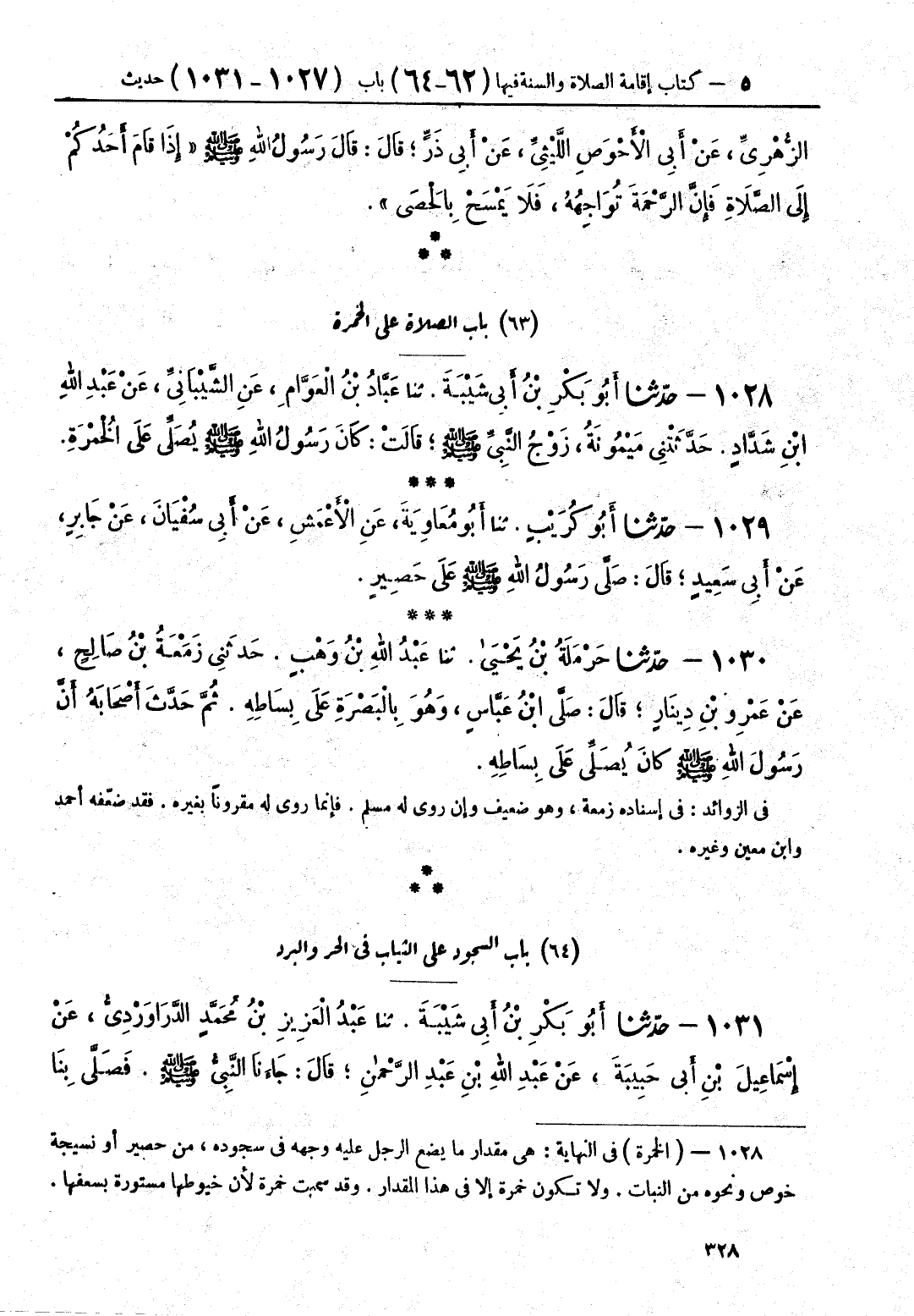 1028 - حَدَّثَنَا أَبُو بَكْرِ بْنُ أَبِي شَيْبَةَ قَالَ: حَدَّثَنَا عَبَّادُ بْنُ الْعَوَّامِّ، عَنِ الشَّيْبَانِيِّ، عَنْ عَبْدِ اللَّهِ بْنِ شَدَّادٍ قَالَ: حَدَّثَتْنِي مَيْمُونَةُ، زَوْجُ النَّبِيِّ صَلَّى اللهُ عَلَيْهِ وَسَلَّمَ، قَالَتْ: كَانَ رَسُولُ اللَّهِ صَلَّى اللهُ عَلَيْهِ وَسَلَّمَ: «§يُصَلِّي عَلَى الْخُمْرَةِ»