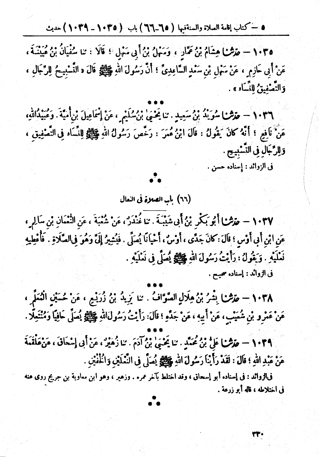 1035 - حَدَّثَنَا هِشَامُ بْنُ عَمَّارٍ، وَسَهْلُ بْنُ أَبِي سَهْلٍ، قَالَا: حَدَّثَنَا سُفْيَانُ بْنُ عُيَيْنَةَ، عَنْ أَبِي حَازِمٍ، عَنْ سَهْلِ بْنِ سَعْدٍ السَّاعِدِيِّ، أَنَّ رَسُولَ اللَّهِ صَلَّى اللهُ عَلَيْهِ وَسَلَّمَ، قَالَ: «§التَّسْبِيحُ لِلرِّجَالِ، وَالتَّصْفِيقُ لِلنِّسَاءِ»