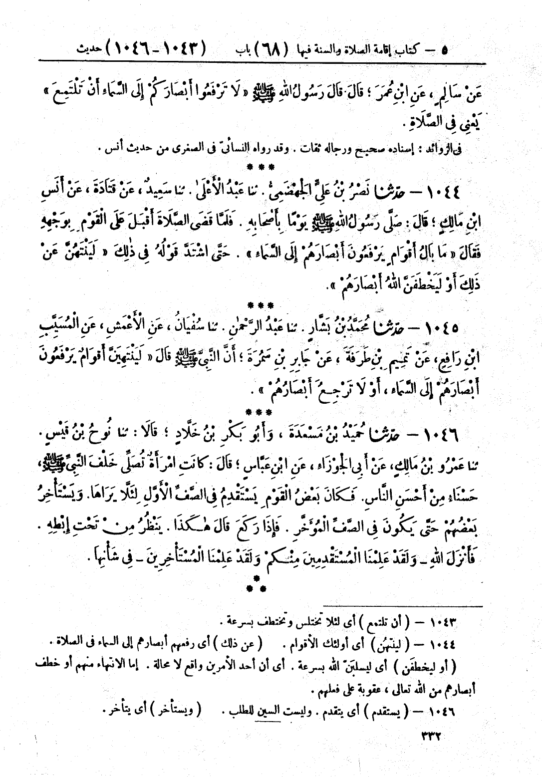 1045 - حَدَّثَنَا مُحَمَّدُ بْنُ بَشَّارٍ قَالَ: حَدَّثَنَا عَبْدُ الرَّحْمَنِ قَالَ: حَدَّثَنَا سُفْيَانُ، عَنِ الْأَعْمَشِ، عَنِ الْمُسَيَّبِ بْنِ رَافِعٍ، عَنْ تَمِيمِ بْنِ طَرَفَةَ، عَنْ جَابِرِ بْنِ سَمُرَةَ، أَنَّ النَّبِيَّ صَلَّى اللهُ عَلَيْهِ وَسَلَّمَ، قَالَ: «§لَيَنْتَهِيَنَّ أَقْوَامٌ يَرْفَعُونَ أَبْصَارَهُمْ إِلَى السَّمَاءِ، أَوْ لَا تَرْجِعُ أَبْصَارُهُمْ»