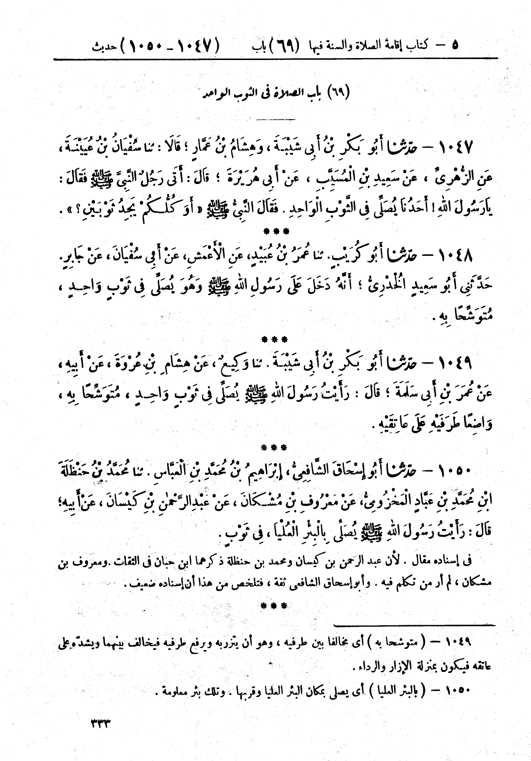 1047 - حَدَّثَنَا أَبُو بَكْرِ بْنُ أَبِي شَيْبَةَ، وَهِشَامُ بْنُ عَمَّارٍ، قَالَا: حَدَّثَنَا سُفْيَانُ بْنُ عُيَيْنَةَ، عَنِ الزُّهْرِيِّ، عَنْ سَعِيدِ بْنِ الْمُسَيِّبِ، عَنْ أَبِي هُرَيْرَةَ، قَالَ: أَتَى رَجُلٌ النَّبِيَّ صَلَّى اللهُ عَلَيْهِ وَسَلَّمَ فَقَالَ: يَا رَسُولَ اللَّهِ §أَحَدُنَا يُصَلِّي فِي الثَّوْبِ الْوَاحِدِ، فَقَالَ النَّبِيُّ صَلَّى اللهُ عَلَيْهِ وَسَلَّمَ: «أَوَكُلُّكُمْ يَجِدُ ثَوْبَيْنِ؟»