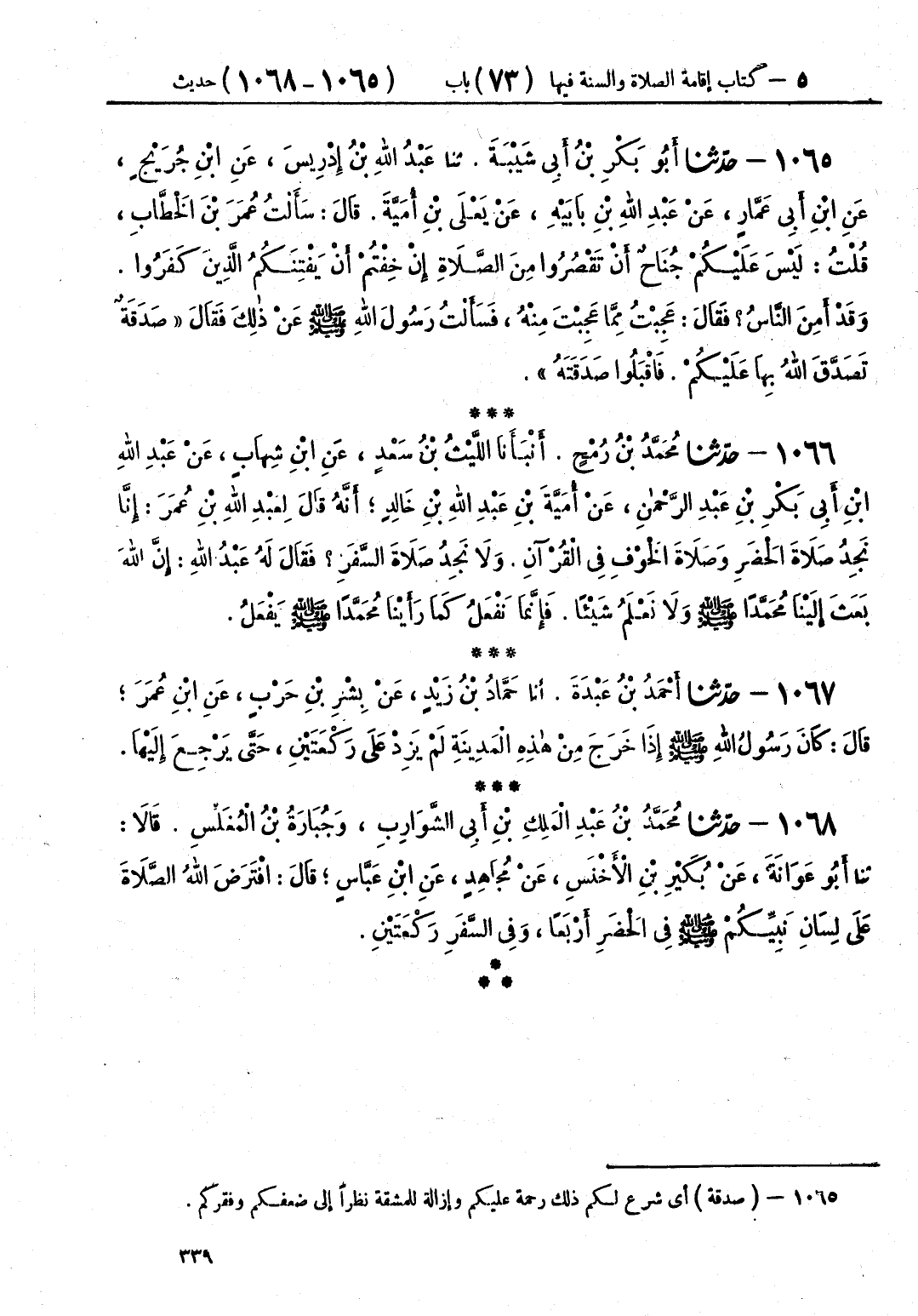 1068 - حَدَّثَنَا مُحَمَّدُ بْنُ عَبْدِ الْمَلِكِ بْنِ أَبِي الشَّوَارِبِ، وَجُبَارَةُ بْنُ الْمُغَلِّسِ، قَالَا: حَدَّثَنَا أَبُو عَوَانَةَ، عَنْ بُكَيْرِ بْنِ الْأَخْنَسِ، عَنْ مُجَاهِدٍ، عَنِ ابْنِ عَبَّاسٍ، قَالَ: «§افْتَرَضَ اللَّهُ الصَّلَاةَ عَلَى لِسَانِ نَبِيِّكُمْ صَلَّى اللهُ عَلَيْهِ وَسَلَّمَ فِي الْحَضَرِ أَرْبَعًا وَفِي السَّفَرِ رَكْعَتَيْنِ»