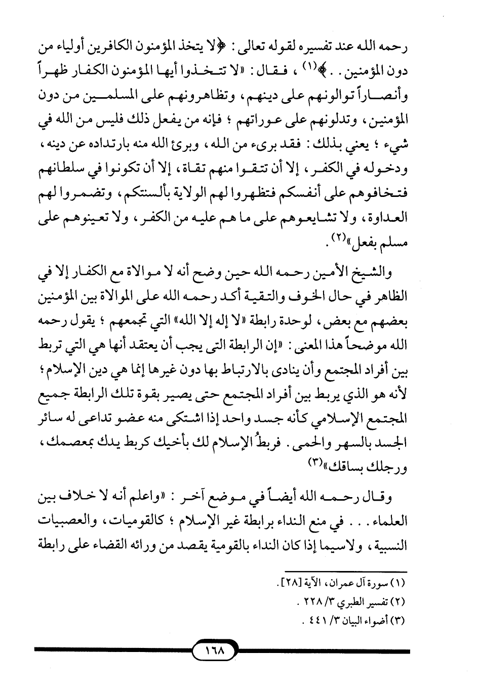 وقال -رحمه الله- أيضاً في موضع آخر: "واعلم أنه لا خلاف بين العلماء ... في منع النداء برابطة غير الإسلام؛ كالقوميات، والعصبيات النسبية، ولا سيما إذا كان النداء بالقومية يقصد من ورائه القضاء على رابطة
