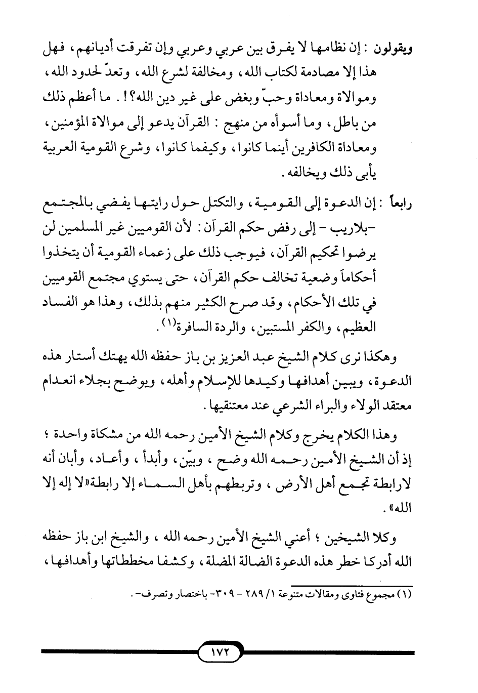 ويقولون: إن نظامها لا يفرق بين عربي وعربي وإن تفرقت أديانهم، فهل هذا إلا مصادمة لكتاب الله، ومخالفة لشرع الله، وتعدّ لحدود الله، وموالاة ومعاداة وحبّ وبغض على غير دين الله؟!. ما أعظم ذلك من باطل، وما أسوأه من منهج: القرآن يدعو إلى موالاة المؤمنين، ومعاداة الكافرين أينما كانوا، وكيفما كانوا، وشرع القومية العربية يأبى ذلك ويخالفه.