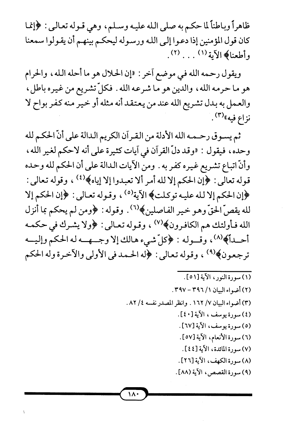 ثم يسوق -رحمه الله- الأدلة من القرآن الكريم الدالة على أنّ الحكم لله وحده، فيقول: "وقد دلّ القرآن في آيات كثيرة على أنه لا حكم لغير الله، وأنّ اتباع تشريع غيره كفر به. ومن الآيات الدالة على أن الحكم لله وحده قوله تعالى: {إِنِ الْحُكْمُ إِلاّ لِلَّهِ أَمَرَ أَلاّ تَعْبُدُوا إِلاّ إِيَّاهُ} 4، وقوله تعالى: {إِنِ الْحُكْمُ إِلاّ لِلَّهِ عَلَيْهِ تَوَكَّلْت} الآية5، وقوله تعالى: {إِنِ الْحُكْمُ إِلاّ لِلَّهِ يَقُصُّ الْحَقَّ وَهُوَ خَيْرُ الْفَاصِلِينَ} 6. وقوله: {وَمَنْ لَمْ يَحْكُمْ بِمَا أَنْزَلَ اللَّهُ فَأُولَئِكَ هُمُ الْكَافِرُونَ} 7، وقوله تعالى: {وَلا يُشْرِكُ فِي حُكْمِهِ أَحَداً} 8، وقوله: {كُلُّ شَيْءٍ هَالِكٌ إِلاّ وَجْهَهُ لَهُ الْحُكْمُ وَإِلَيْهِ تُرْجَعُونَ} 9، وقوله تعالى: {لَهُ الْحَمْدُ فِي الآولَى وَالآخِرَةِ وَلَهُ الْحُكْمُ