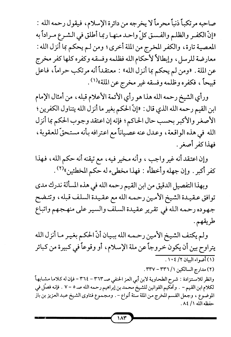 وانظر للاستزادة: شرح الطحاوية لابن أبي العز الحنفي ص363-364 –فإن له كلاماً مشابهاً لكلام ابن القيم-. وتحكيم القوانين للشيخ محمد بن إبراهيم -رحمه الله- ص5-7. فإنه فصّل في الموضوع، وجعل القسم المخرج من الملة ستة أنواع-. ومجموع فتاوى الشيخ عبد العزيز بن باز حفظه الله 1/84.