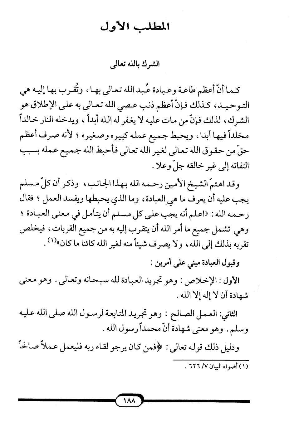 وقد اهتمّ الشيخ الأمين -رحمه الله- بهذا الجانب، وذكر أن كلّ مسلم يجب عليه أن يعرف ماهي العبادة، وما الذي يحبطها ويفسد العمل؛ فقال -رحمه الله-: "اعلم أنه يجب على كل مسلم أن يتأمل في معنى العبادة؛ وهي تشمل جميع ما أمر الله أن يتقرب إليه به من جميع القربات، فيخلص تقربه بذلك إلى الله، ولايصرف شيئاً منه لغير الله كائنا ماكان"1.