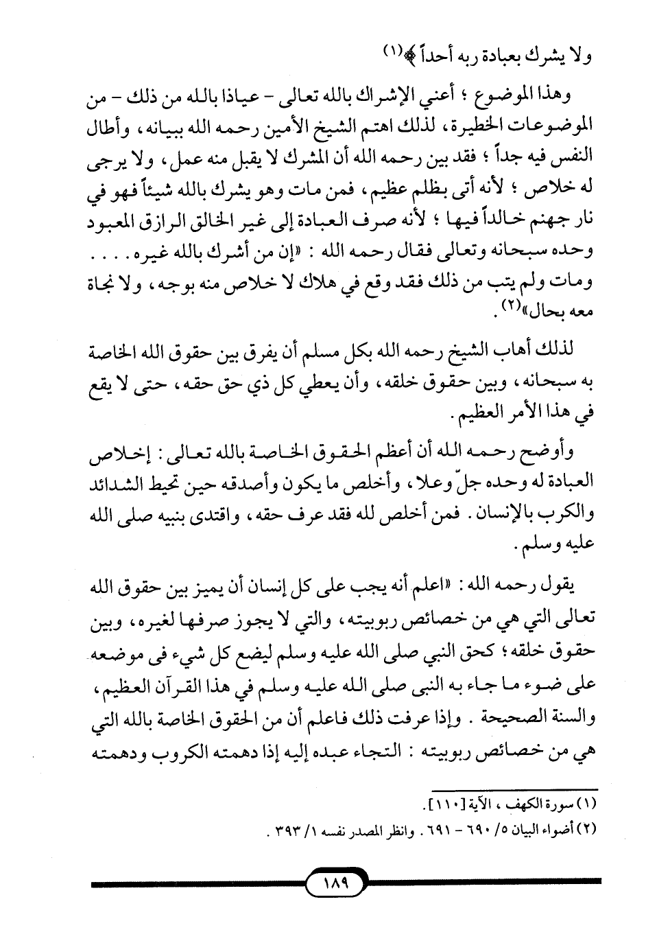 يقول -رحمه الله-: "اعلم أنه يجب على كل إنسان أن يميز بين حقوق الله تعالى التي هي من خصائص ربوبيته، والتي لا يجوز صرفها لغيره، وبين حقوق خلقه؛ كحق النبي صلى الله عليه وسلم ليضع كل شيء في موضعه على ضوء ماجاء به النبي صلى الله عليه وسلم في هذا القرآن العظيم، والسنة الصحيحة. وإذا عرفت ذلك فاعلم أن من الحقوق الخاصة بالله التي هي من خصائص ربوبيته: التجاء عبده إليه إذا دهمته الكروب ودهمته