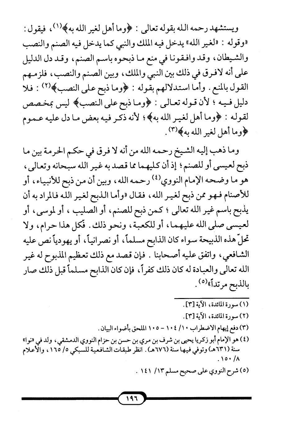 وما ذهب إليه الشيخ -رحمه الله- من أنه لافرق في حكم الحرمة بين ما ذبح لعيسى أو للصنم؛ إذ إن كليهما مما قصد به غير الله سبحانه وتعالى، هو ما وضحه الإمام النووي4-رحمه الله-، وبين أن من ذبح للأنبياء، أو للأصنام فهو ممن ذبح لغير الله، فقال: "وأما الذبح لغير الله فالمراد به أن يذبح باسم غير الله تعالى؛ كمن ذبح للصنم، أو الصليب، أو لموسى، أو لعيسى صلى الله عليهما، أو للكعبة، ونحو ذلك. فكلّ هذا حرام، ولا تحلّ هذه الذبيحة سواء كان الذابح مسلماً، أو نصرانياً، أو يهودياً، نص عليه الشافعي، واتفق عليه أصحابنا. فإن قصد مع ذلك تعظيم المذبوح له غير الله تعالى والعبادة له كان ذلك كفراً، فإن كان الذابح مسلماً قبل ذلك صار بالذبح مرتداً"5.
