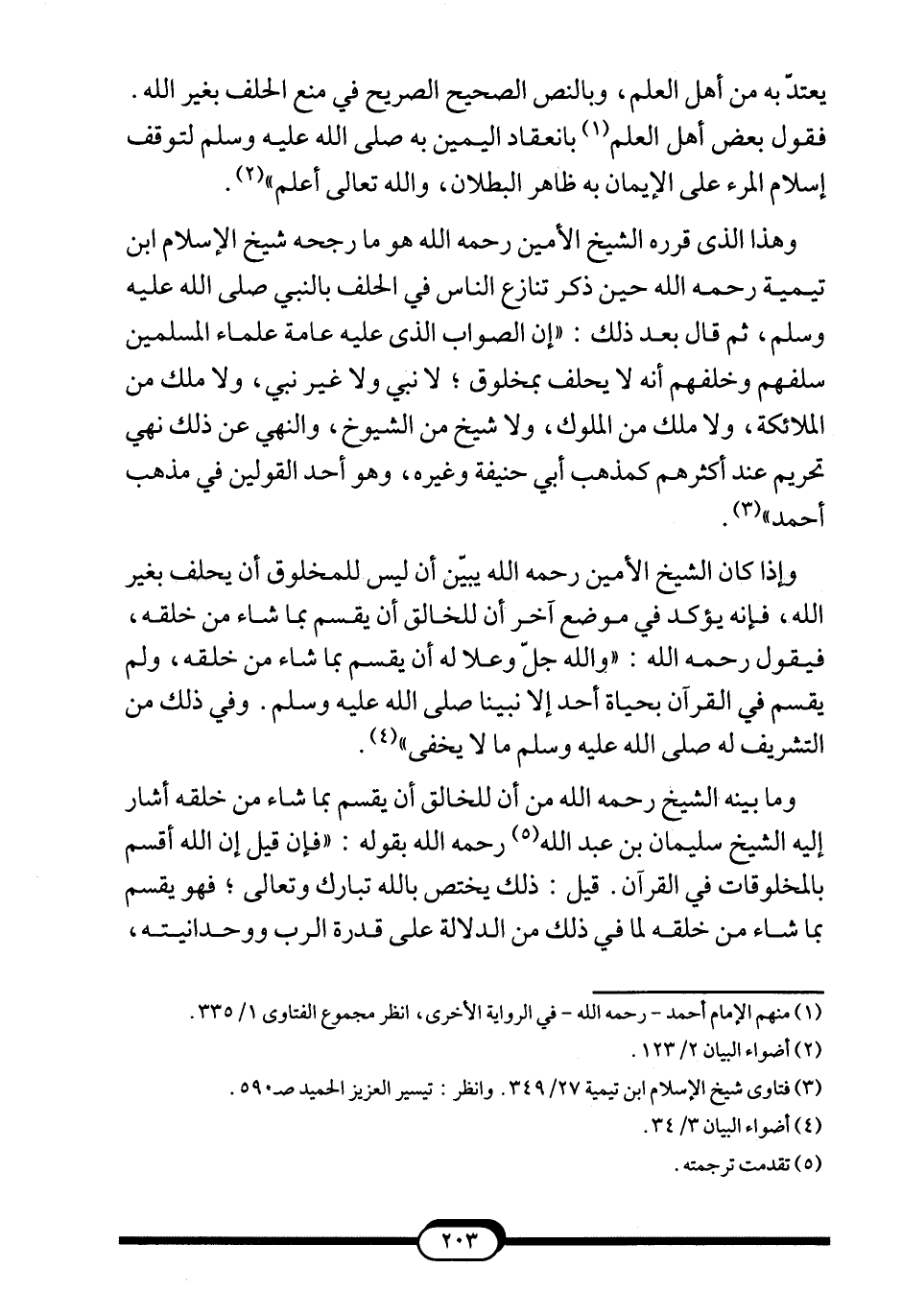 وهذا الذي قرره الشيخ الأمين -رحمه الله- هو ما رجحه شيخ الإسلام ابن تيمية -رحمه الله- حين ذكر تنازع الناس في الحلف بالنبي صلى الله عليه وسلم , ثم قال بعد ذلك: "إن الصواب الذي عليه عامة علماء المسلمين سلفهم وخلفهم أن لا يحلف بمخلوق؛ لا نبي ولا غير نبي، ولا ملك من الملائكة، ولا ملك من الملوك، ولا شيخ من الشيوخ، والنهي عن ذلك نهي تحريم عند أكثرهم كمذهب أبي حنيفة وغيره، وهو أحد القولين في مذهب أحمد" 3.