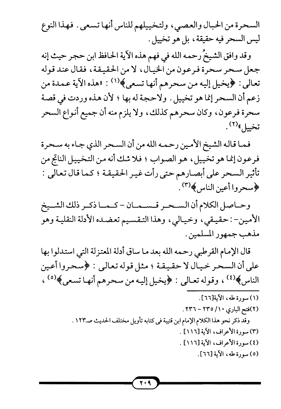 قال الإمام القرطبي -رحمه الله- بعد ما ساق أدلة المعتزلة التي استدلوا بها علىأن السحر خيال لا حقيقة؛ مثل قوله تعالى: {سَحَرُوا أَعْيُنَ النَّاس} 4، وقوله تعالى: {يُخَيَّلُ إِلَيْهِ مِنْ سِحْرِهِمْ أَنَّهَا تَسْعَى} 5،