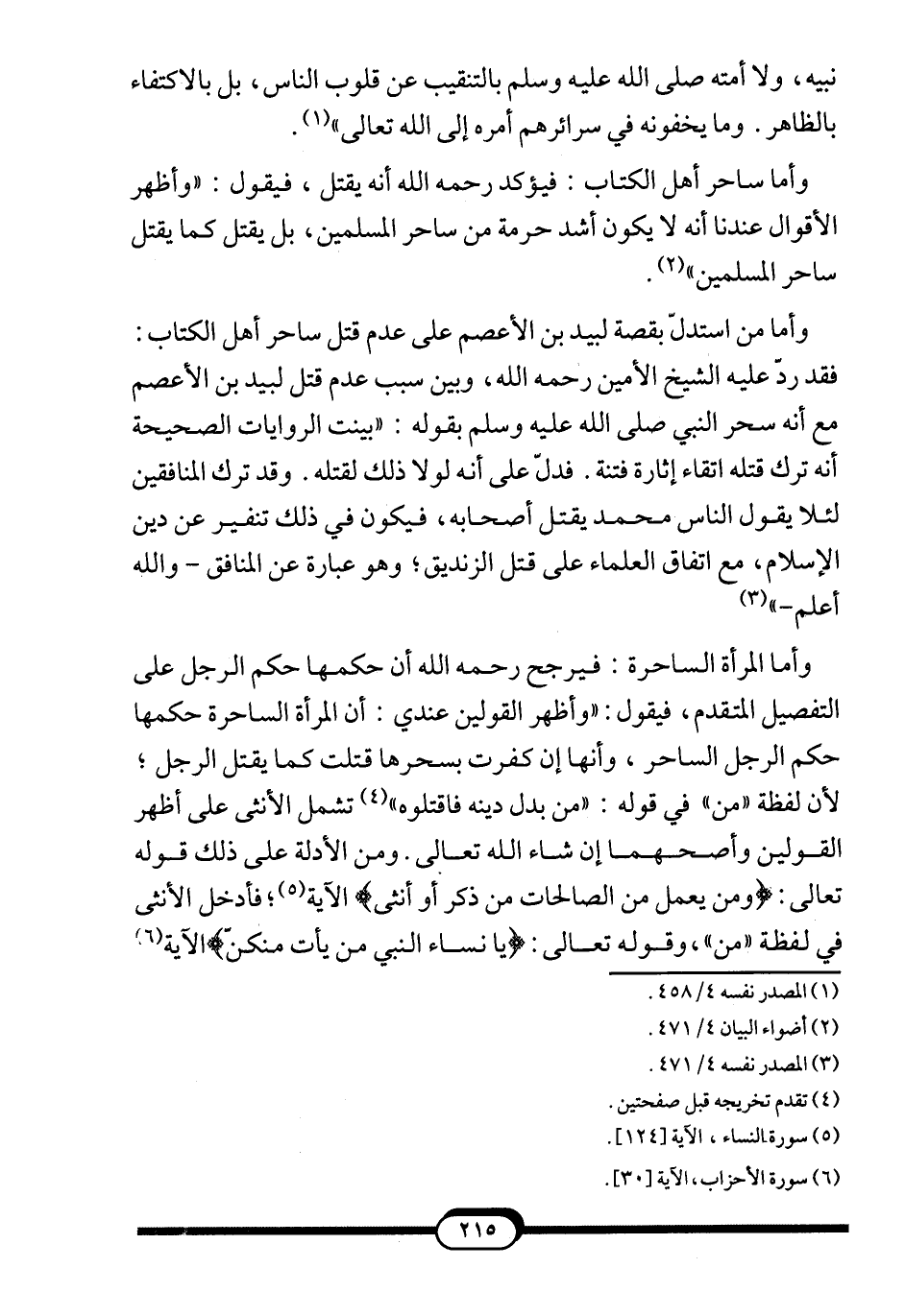 وأما من استدلّ بقصة لبيد بن الأعصم على عدم قتل ساحر أهل الكتاب: فقد ردّ الشيخ الأمين -رحمه الله-، وبين سبب عدم قتل لبيد بن الأعصم مع أنه سحر النبي صلى الله عليه وسلم بقوله: "بينت الروايات الصحيحة أنه ترك قتله اتقاء إثارة فتنة. فدلّ على أنه لولا ذلك لقتله. وقد ترك المنافقين لئلا يقول الناس محمد يقتل أصحابه، فيكون في ذلك تنفير عن دين الإسلام، مع اتفاق العلماء على قتل الزنديق؛ وهو عبارة عن المنافق –والله أعلم-"3.