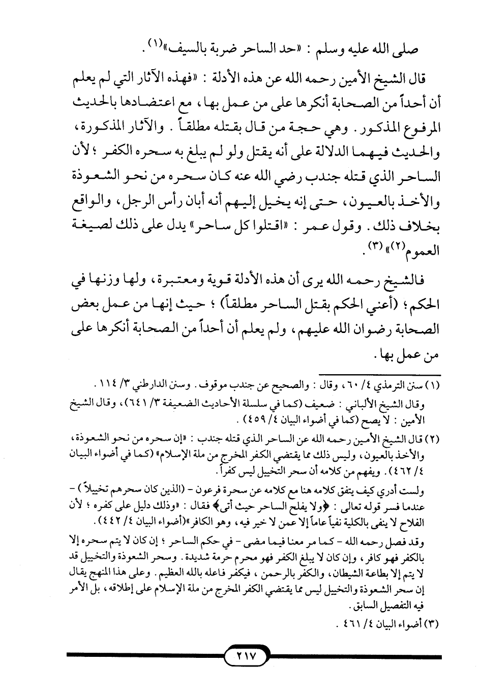 قال الشيخ الأمين -رحمه الله- عن هذه الأدلة: "فهذه الآثار التي لم يعلم أن أحداً من الصحابة أنكرها على من عمل بها، مع اعتضادها بالحديث المرفوع المذكور. وهي حجة من قال بقتله مطلقاً. والآثار المذكورة، والحديث فيهما الدلالة على أنه يقتل ولو لم يبلغ به سحره الكفر؛ لأن الساحر الذي قتله جندب رضي الله عنه كان سحره من نحو الشعوذة والأخذ بالعيون، حتى إنه يخيل إليهم أنه أبان رأس الرجل، والواقع بخلاف ذلك. وقول عمر: "اقتلوا كل ساحر" يدل على ذلك لصيغة العموم2"3.
